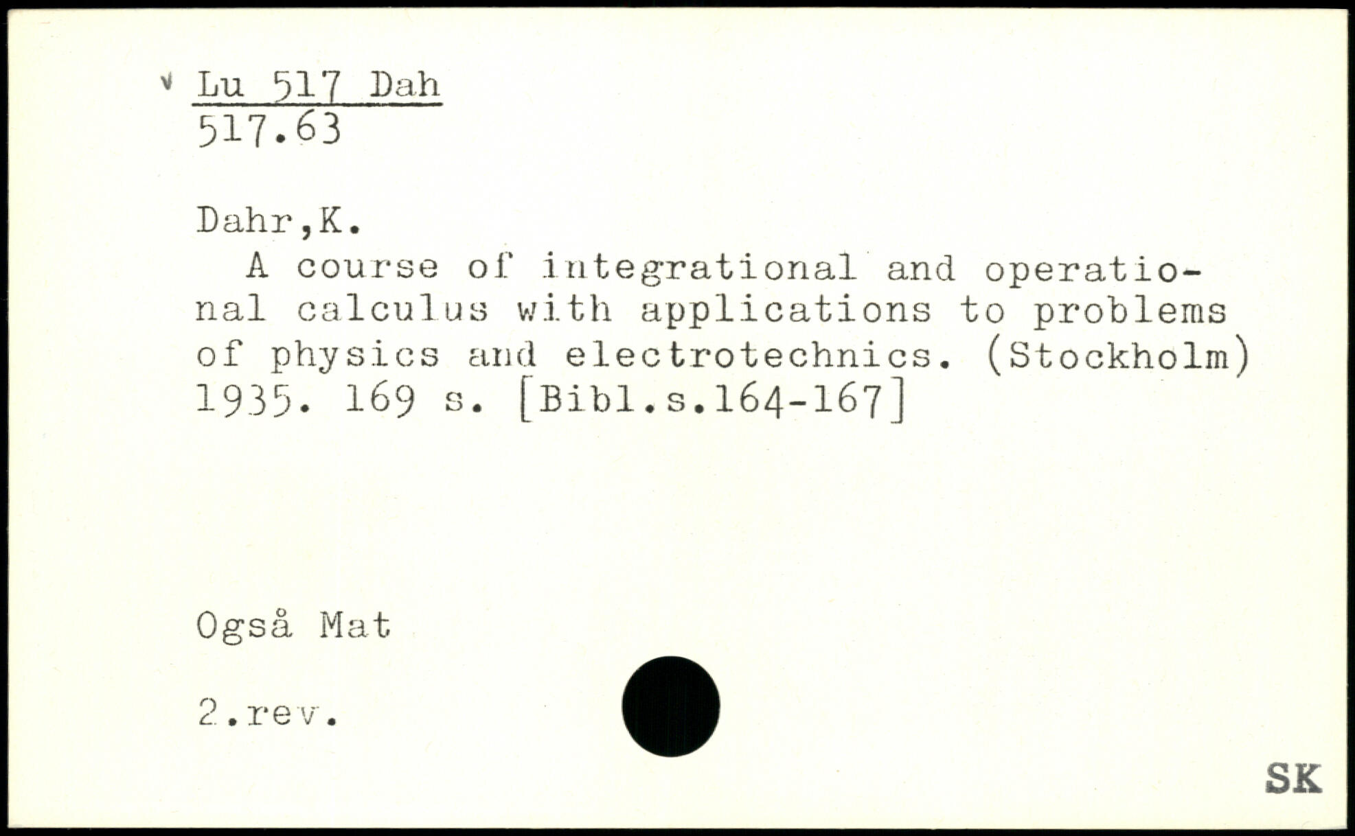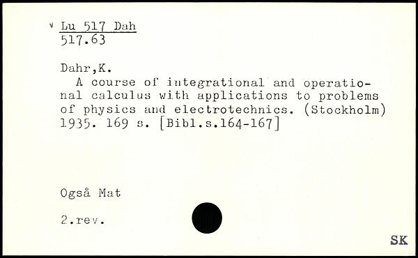 A course of integrational and operational calculus with applications to problems of physics and electrotechnics. (Stockholm) 1935.