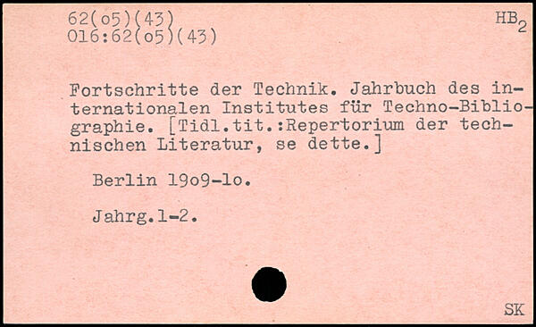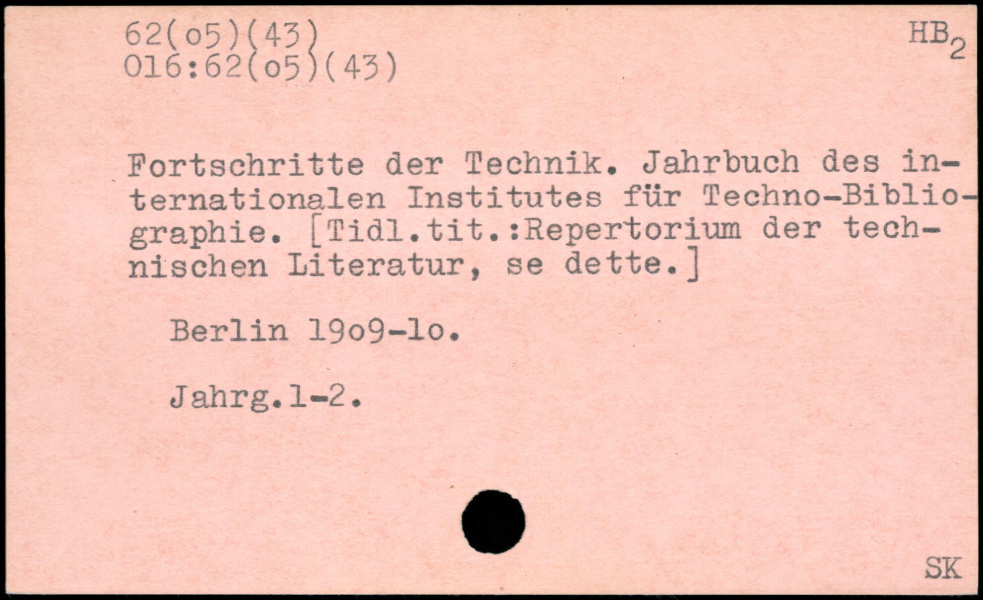 Fortschritte der Technik. Jahrbuch des internationalen Institutes für Techno-Bibliographie. [Tidl.tit.sRepertorium der technischen Literatur, se dette.] Berlin 19o9-lo. Jahrg.1-2.