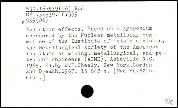 Radiation effects. Based on a symposium sponsored by the Nuclear metallurgy committee of the Institute of metals division, the Metallurgical society of the American institute of mining, metallurgical, and petroleum engineers (AIME), Asheville,N.C. 1965. Ed.by V.F.Sheely. New^