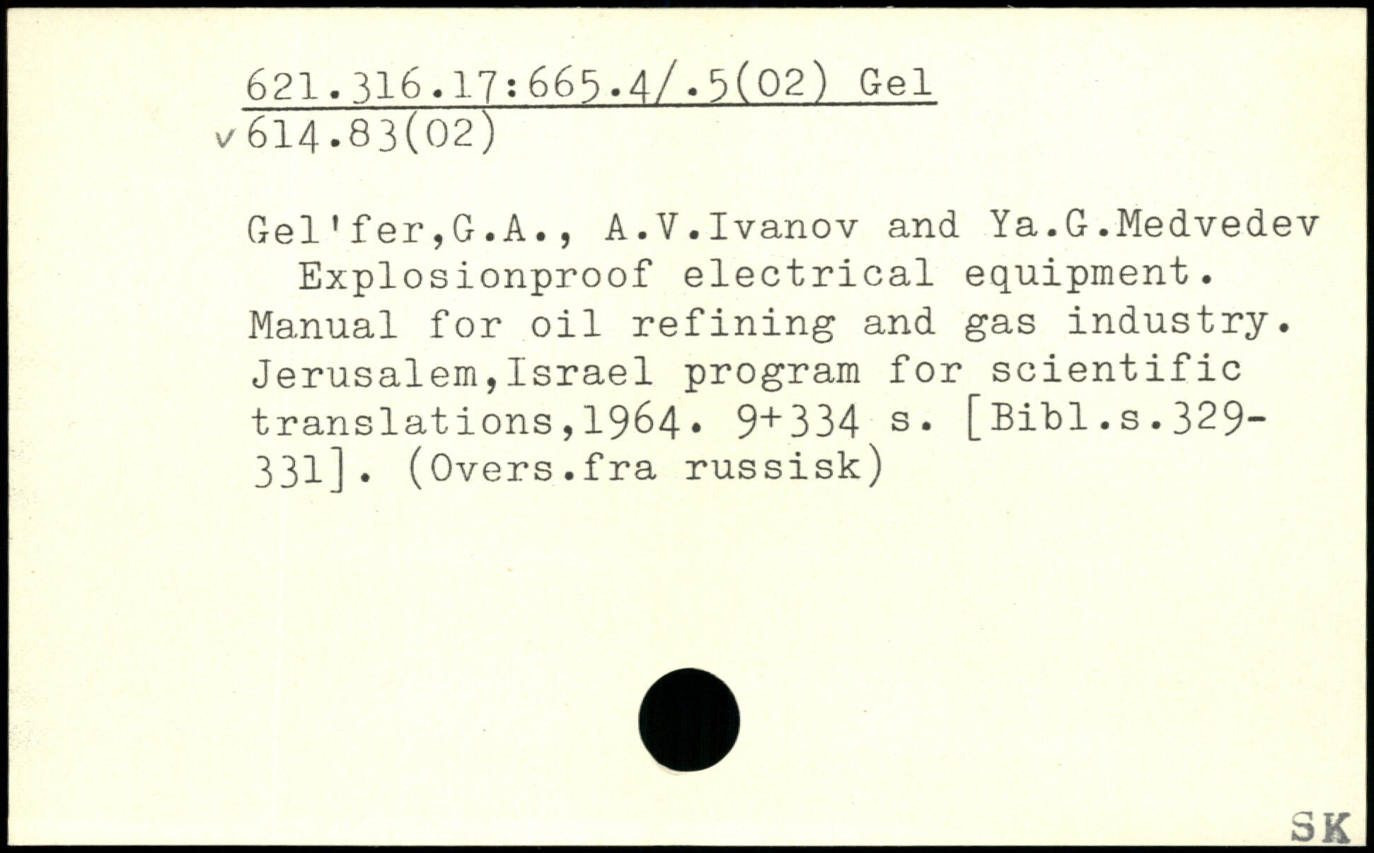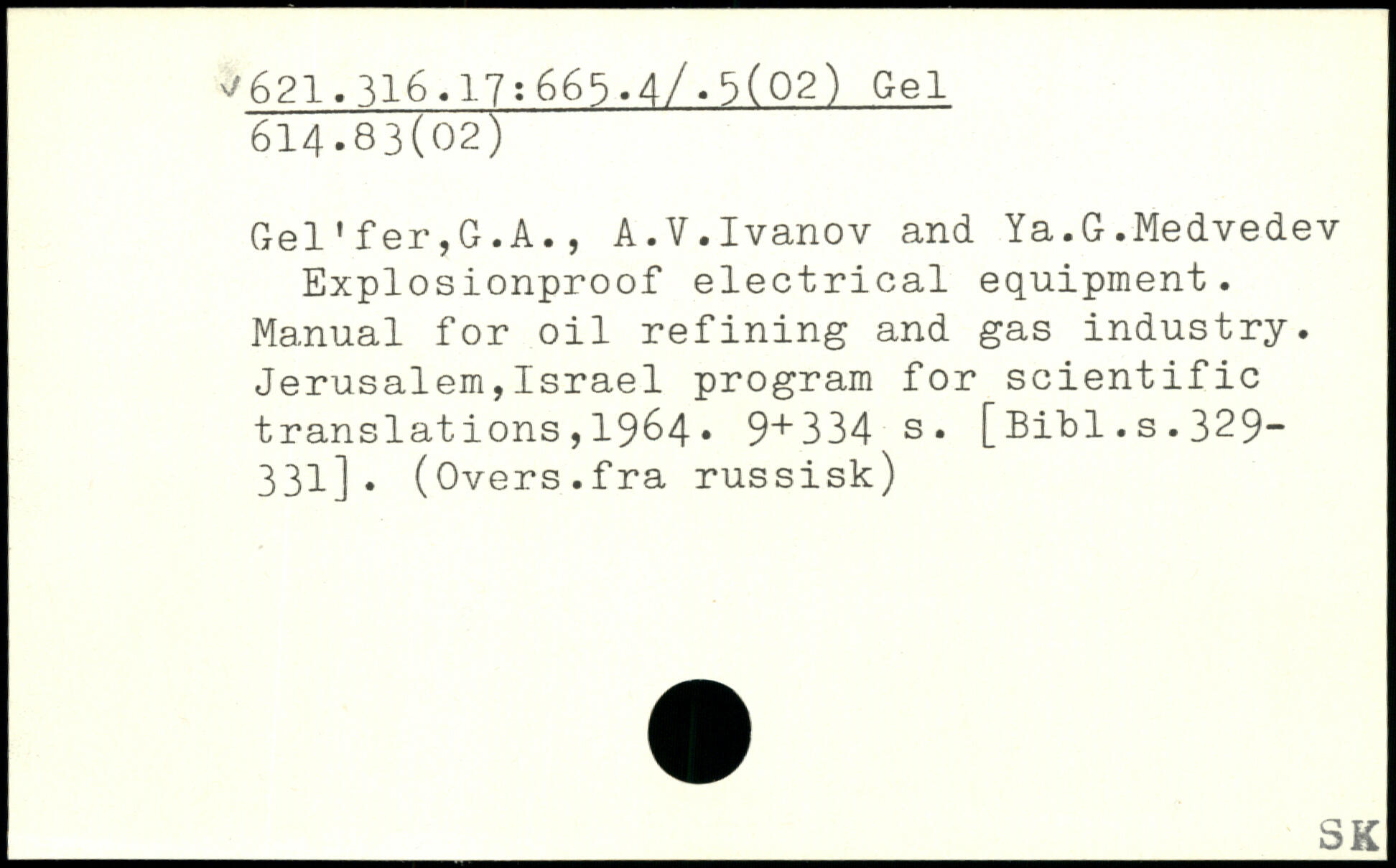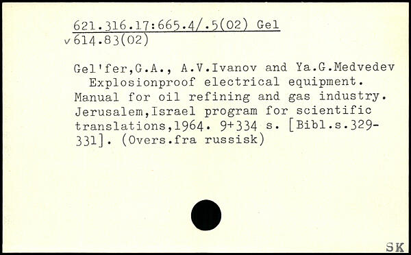 Gel'fer,G.A., A.V.Ivanov and Ya.G.Medvedev Explosionproof electrical equipment. Manual for oil refining and gas industry. Jerusalem,Israel program for scientific translations,1964.