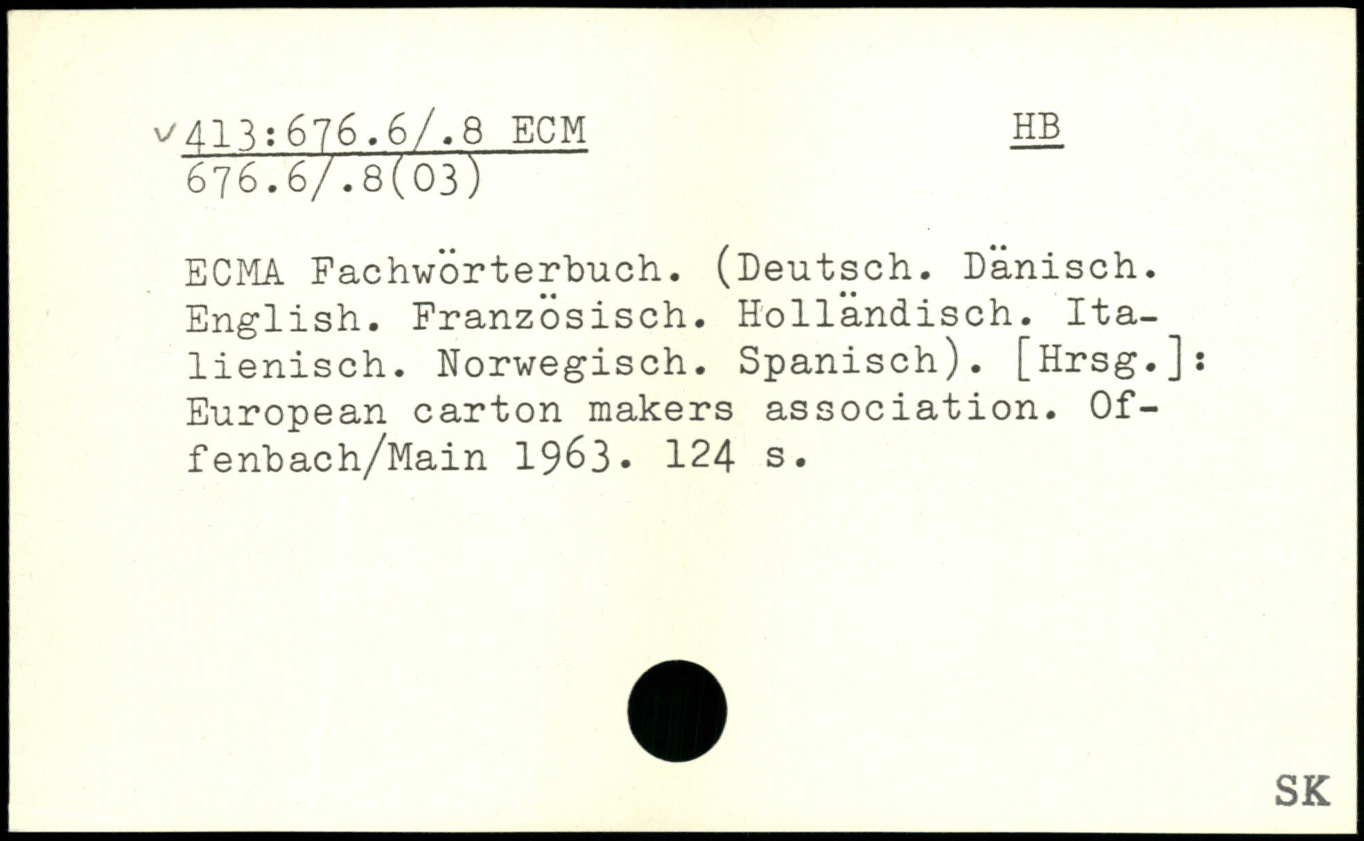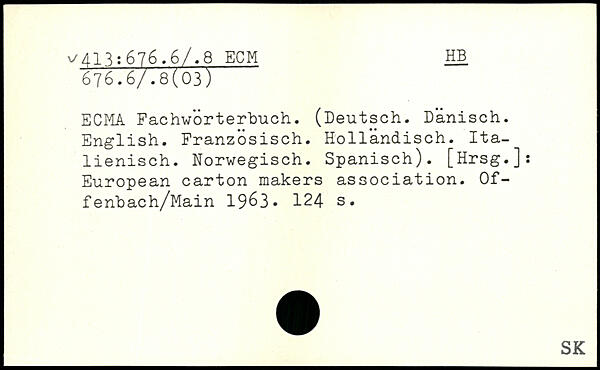 ECMA Fachwörterbuch. (Deutsch. Dänisch. English. Französisch. Holländisch. Italienisch. Norwegisch. Spanisch). [Hrsg.]: European carton makers association. Of-fenbach/Main 1963-