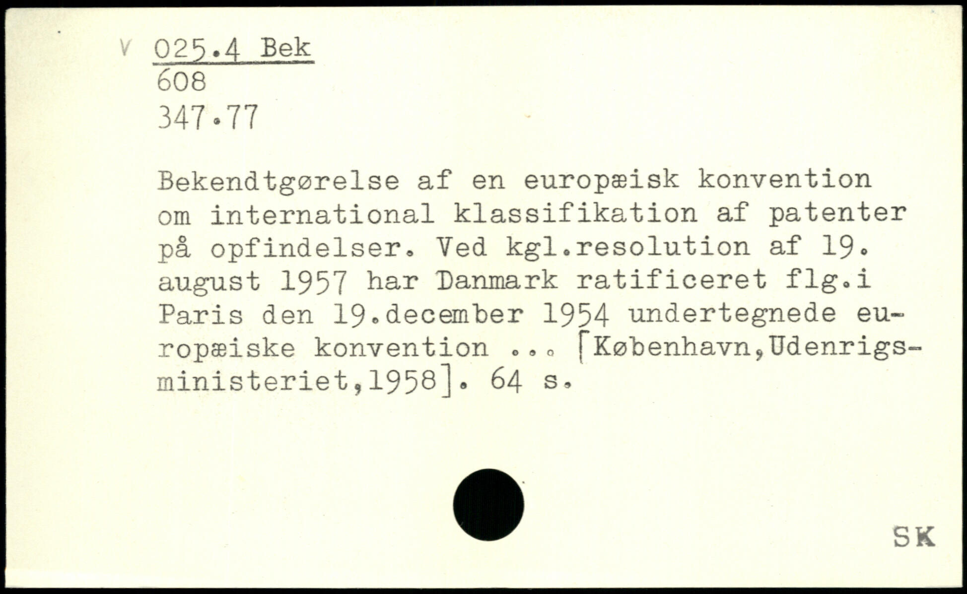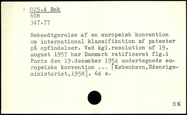 Bekendtgørelse af en europæisk konvention om international klassifikation af patenter på opfindelser. Ved kgl.resolution af 19, august 1957 har Danmark ratificeret flg.i Paris den 19-december 1954 undertegnede europæiske konvention ..o [