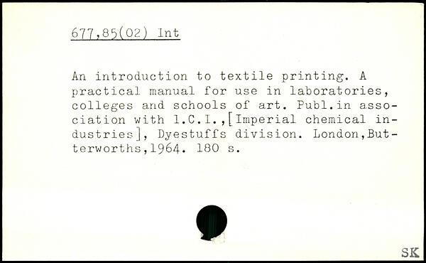 An introduction to textile printing. A practical manual for use in laboratories, colleges and schools of art. Publ.in association with 1.C.I.,[Imperial chemical industries], Dyestuffs division.