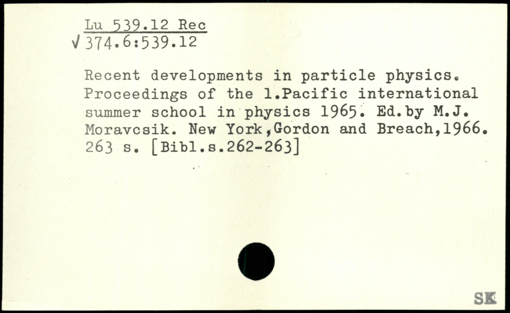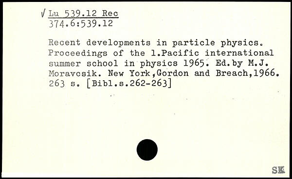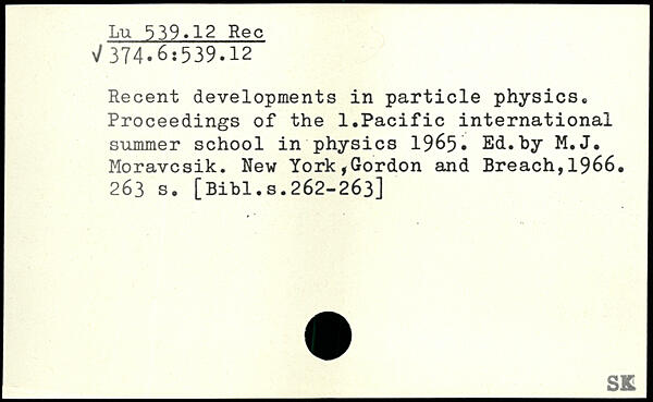 Recent developments in particle physics, Proceedings of the 1.Pacific international summer school in physics 1965. Ed.by M.J. Moravcsik.