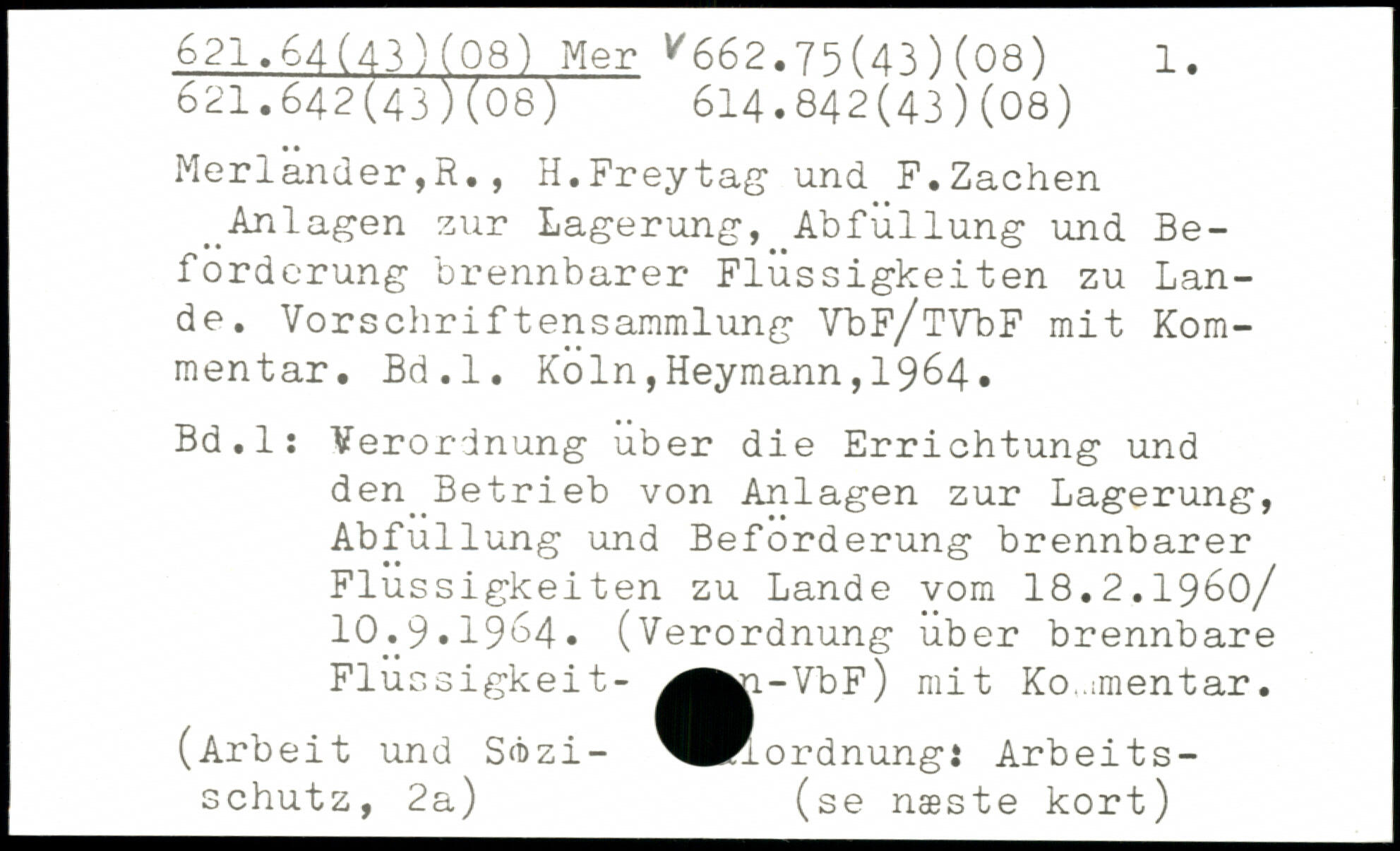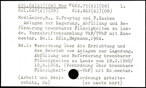 Merlander,R., H.Freytag und F.Zachen ^Anlagen zur Lagerung, Abfüllung und Beförderung brennbarer Flussigkeiten zu Lande. Vorschriftensammlung VbF/TVbF mit Kommentar. Bd.l.