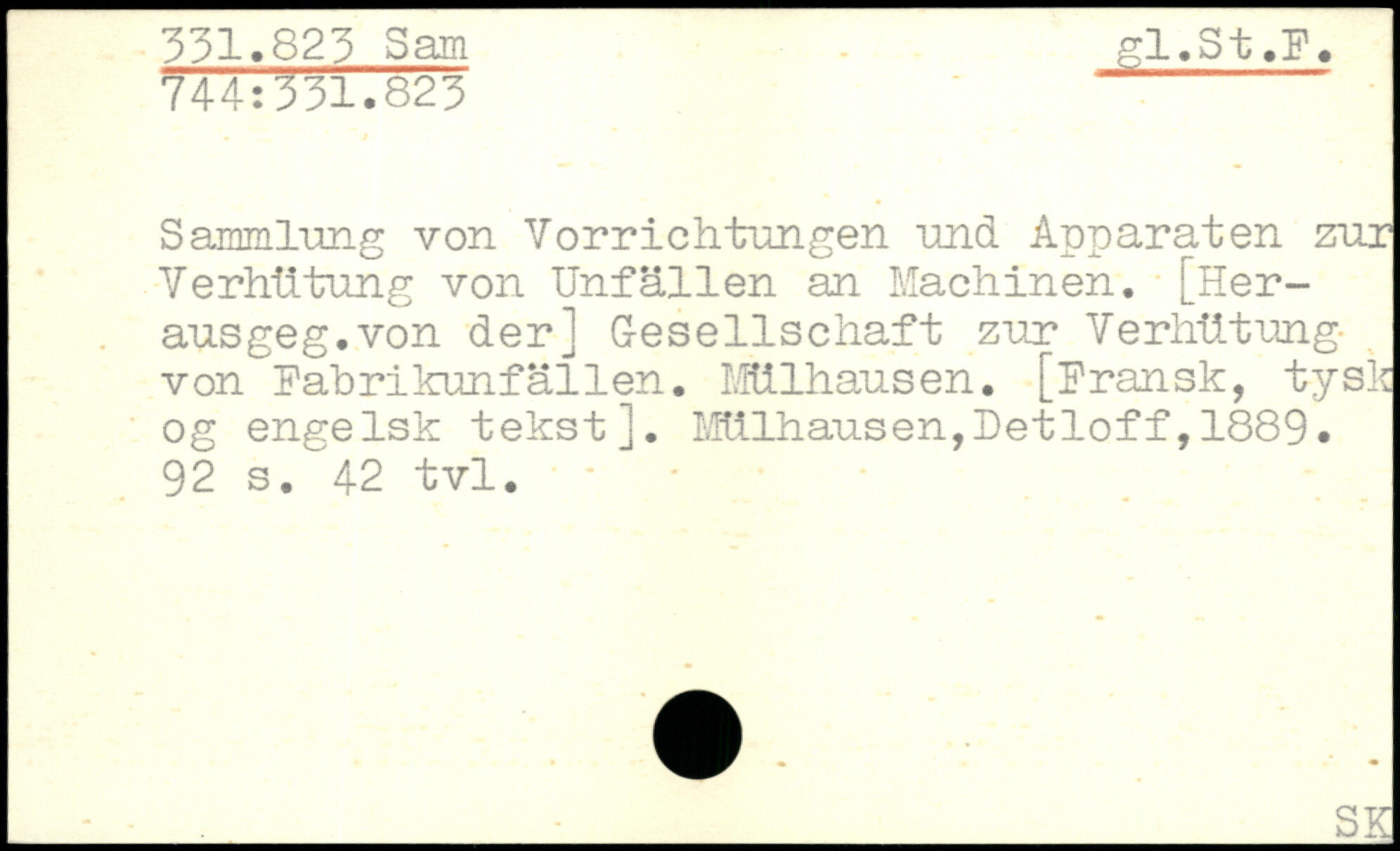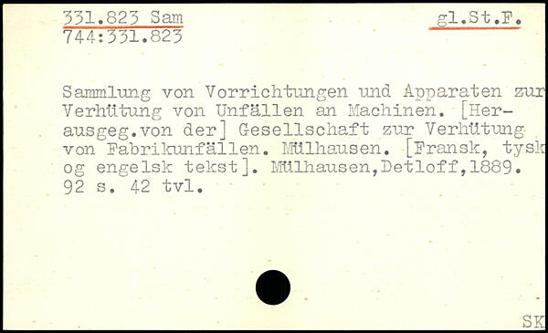 Sammlung von Vorrichtungen und Apparaten zur Verhütung von Unfällen an Machinen. [Heraus ge g. von der] Gesellschaft zvx Verhütung von Pabrikunfallen. Mülhausen. [Pransk, tysk og engelsk tekstj.