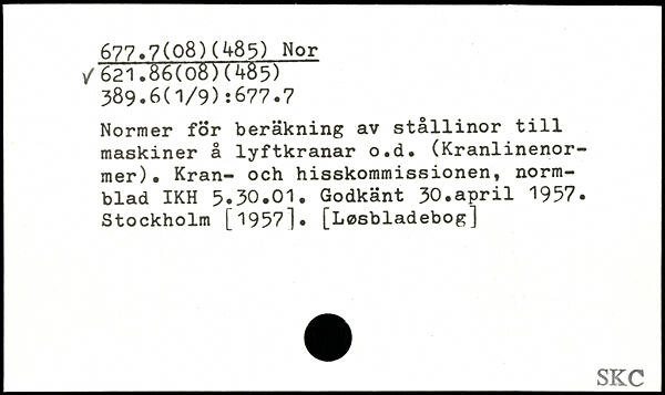 Normer för beräkning av stållinor till maskiner a lyftkranar o.d, (Kranlinenor-mer). Kran- och hisskommissionen, normblad IKH 5,30,01. Godkänt 30.april 1957.