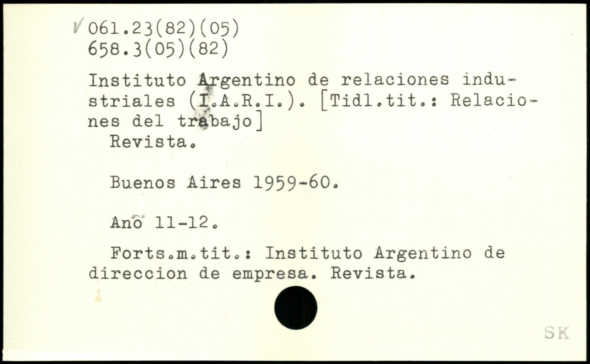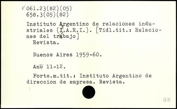 Instituto A^rgentino de relaciones industriales (x.À.R.I.). [Tidl.tit.: Relaciones del tr^ibajo] Revista, Buenos Aires 1959-60. Ano 11-12. Ports.m.tit.: Instituto Argentino de direccion de empresa. Revista.