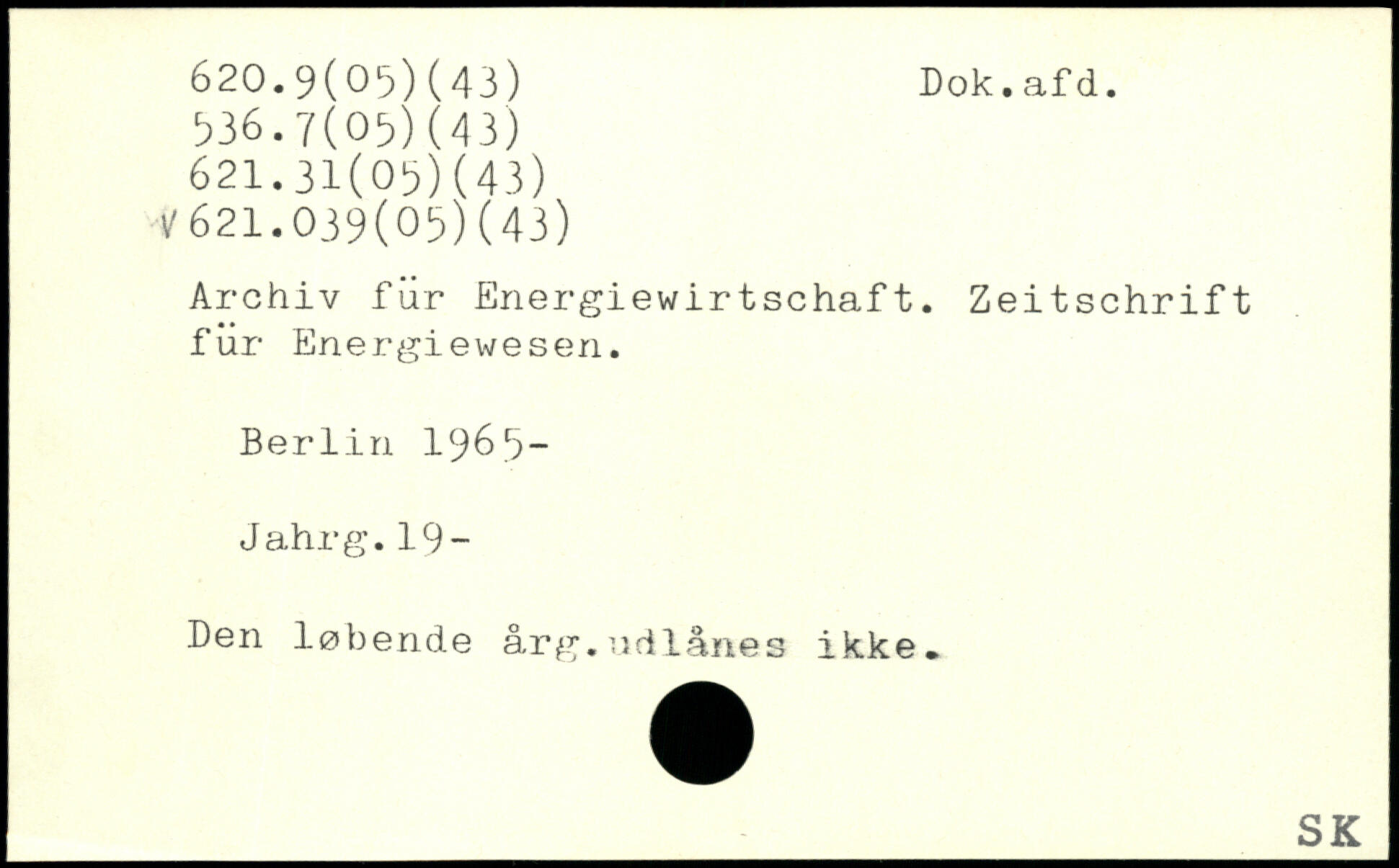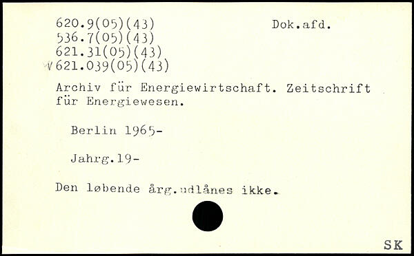 Archiv für Energiewirtschaft. Zeitschrift für Energiewesen. Berlin 196.3- Jahrg.19- Den løbende årg.udlånes ikke.