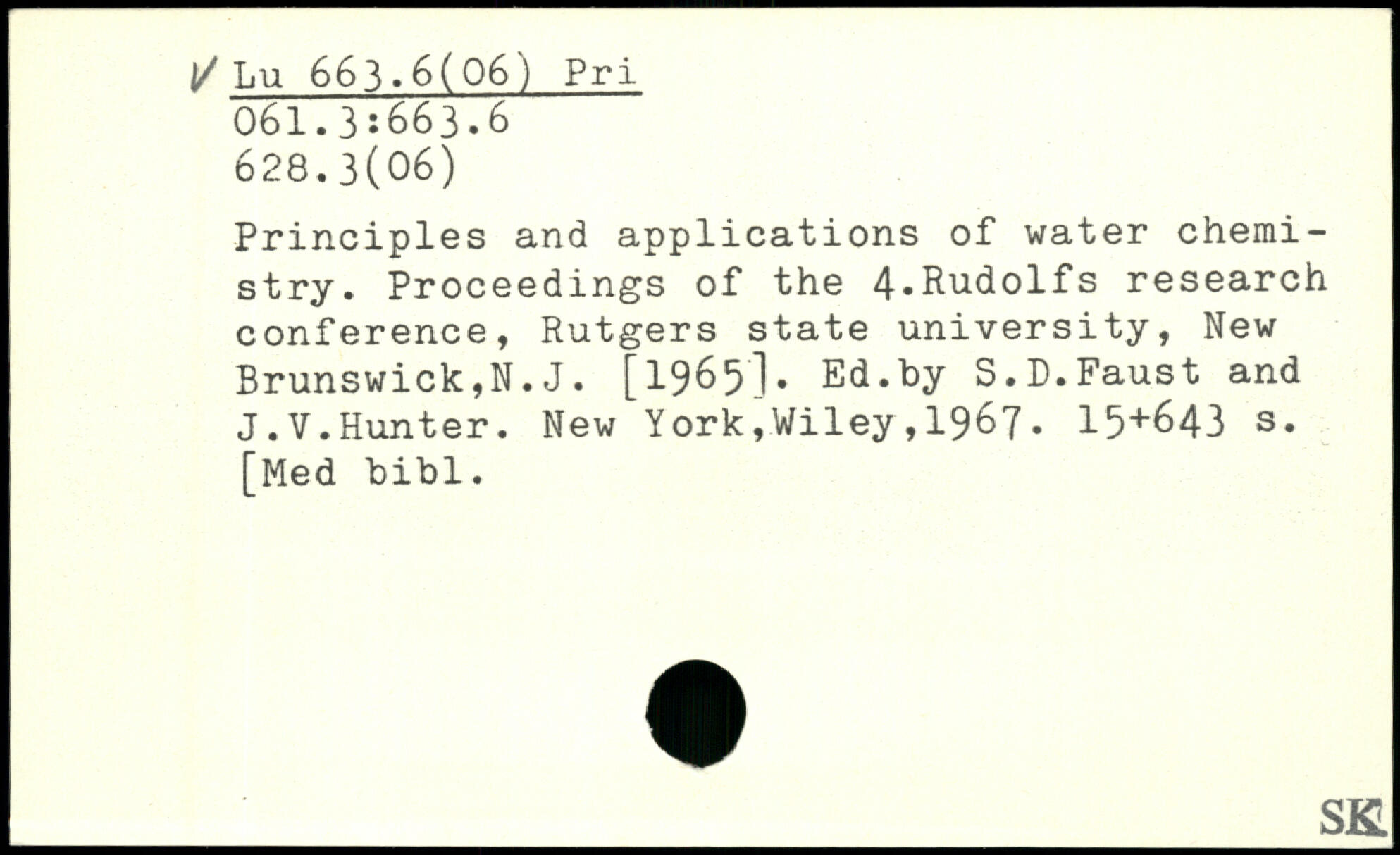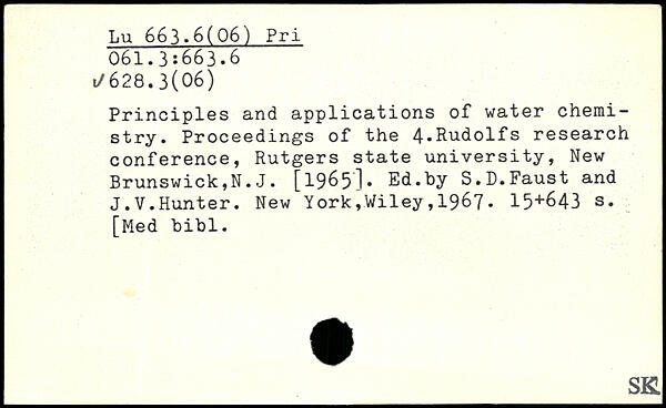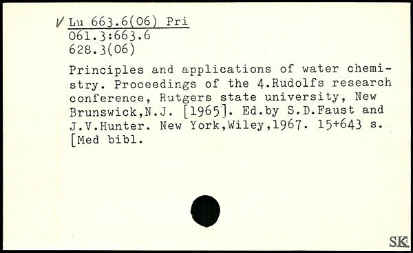 Principles and applications of water chemistry. Proceedings of the 4.Rudolfs research conference, Rutgers state university, New Brunswick,N.J. [1965]. Ed.by S.D.Faust and J.V.Hunter.