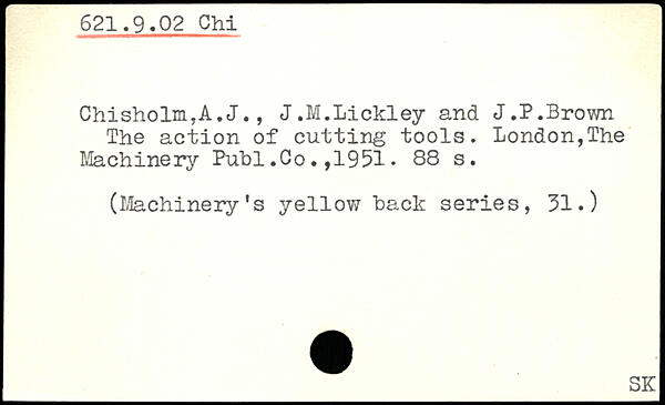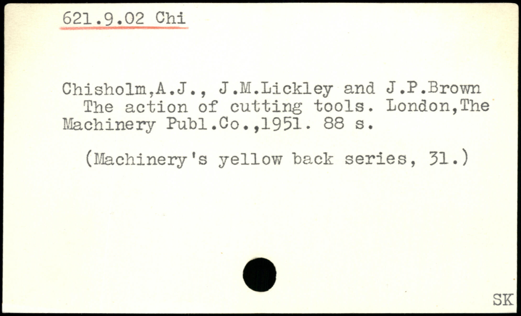 Chisholm,A.J., J.M.Llckley and J.P.Brown The action of cutting tools. London,The Machinery Publ.Go. ,1951.