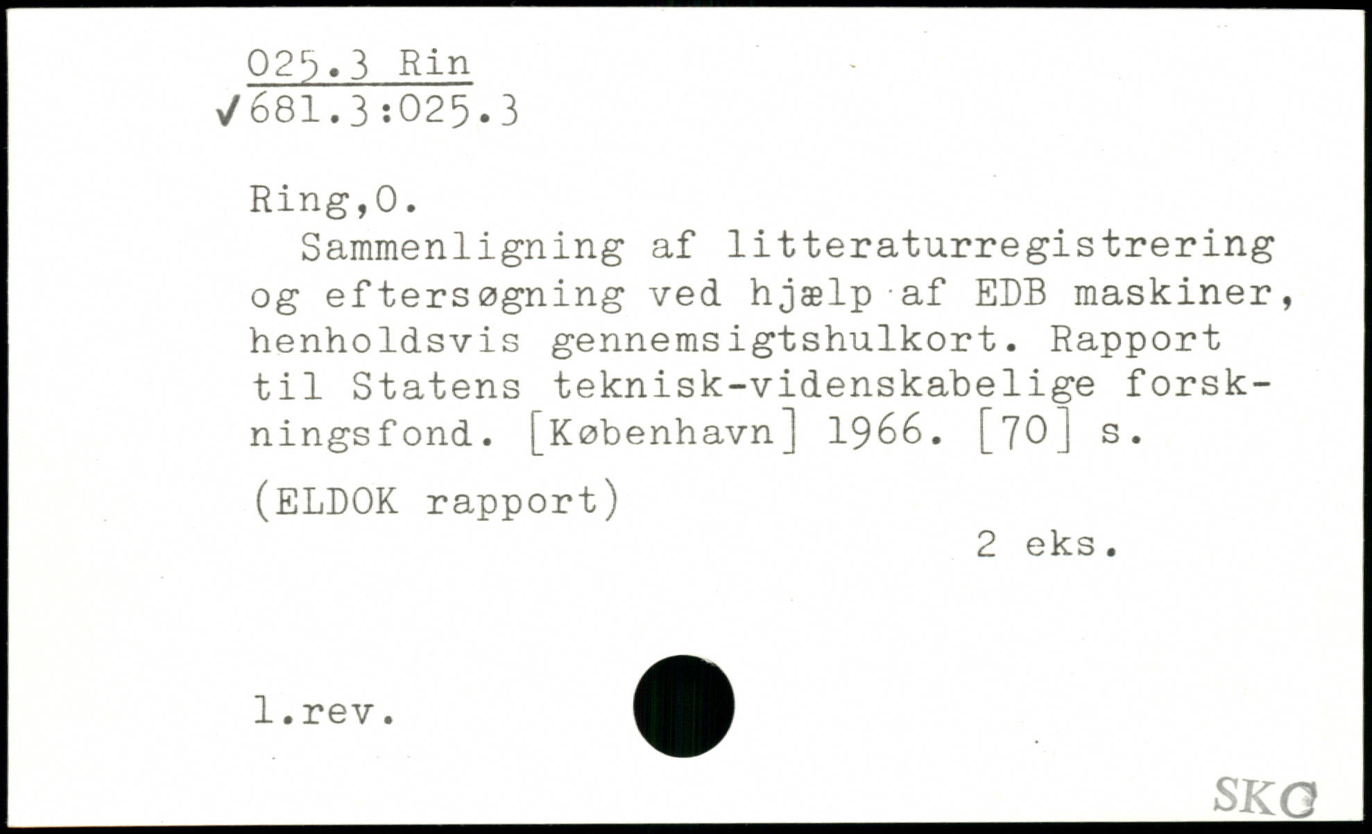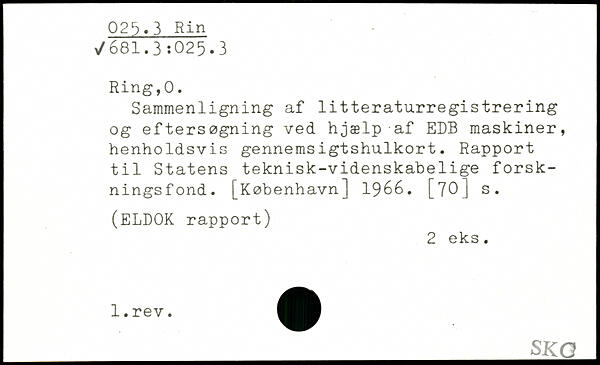 Sammenligning af litteraturregistrering og eftersøgning ved hjælp af EDB maskiner, henholdsvis gennemsigtshulkort. Rapport til Statens teknisk-videnskabelige forskningsfond.