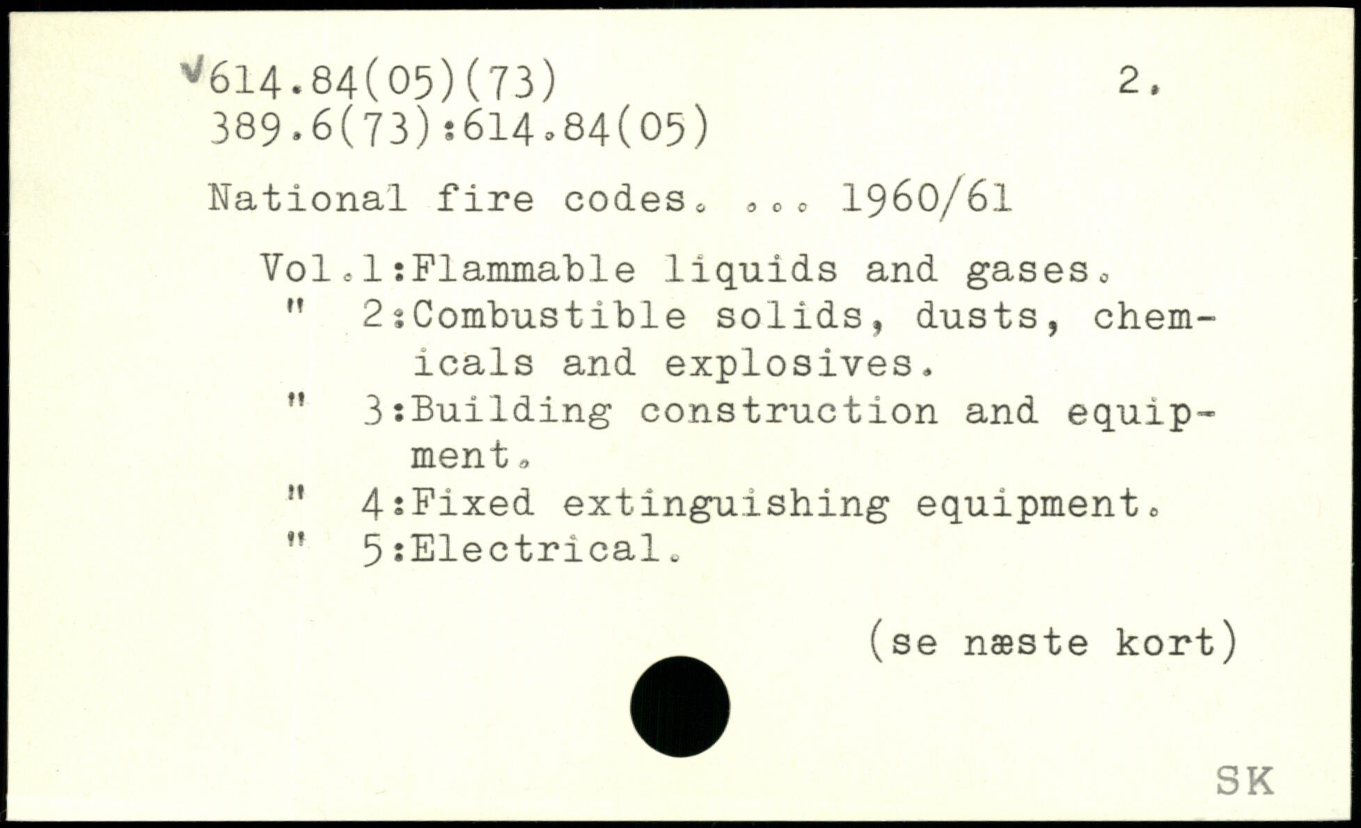 National fire codes6 00o 1960/61 Vol,1tFlammable liquids and gases0 " 2sCombustible solids, dusts, chem icals and explosives. ” 3:Building construction and equipment a ” 4-iFixed extinguishing equipment, 5 :Electricalu