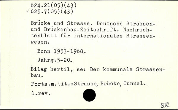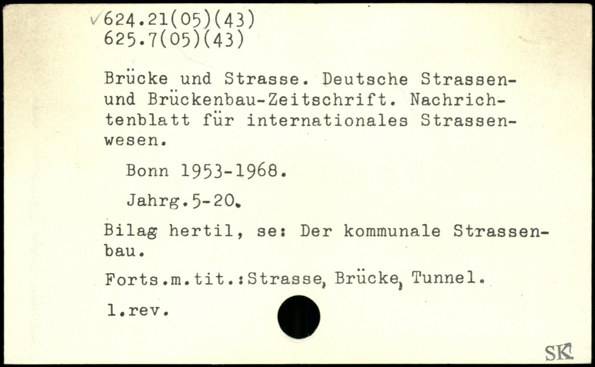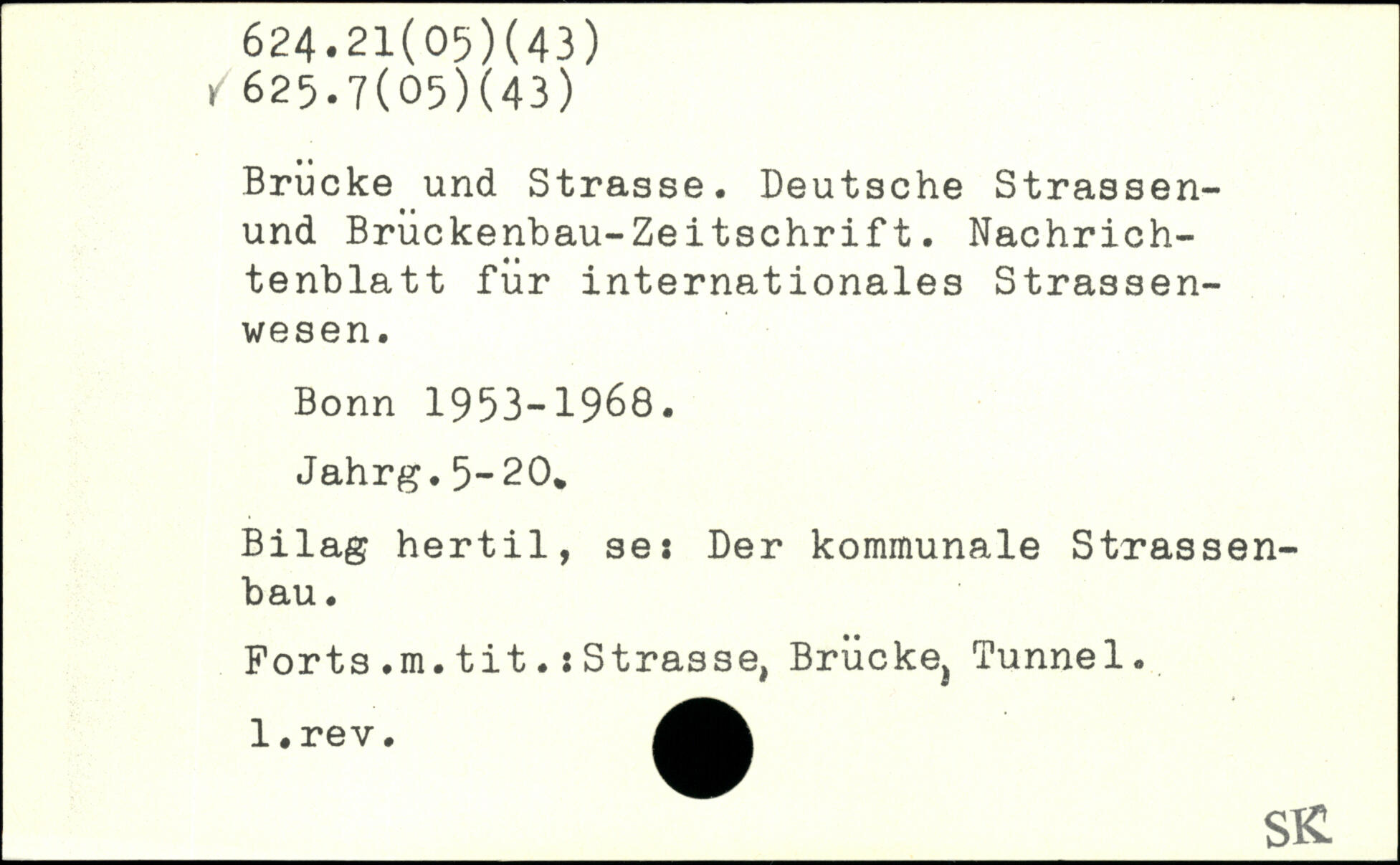 Brücke und Strasse. Deutsche Strassen-und Brückenbau-Zeitschrift. Nachrichtenblatt für internationales Strassen-wesen. Bonn 1953-1968. Jahrg.5-20. Bilag hertil, se: Der kommunale Strassen-bau. Forts .m. tit. s Strasse, Brückej Tunnel. _