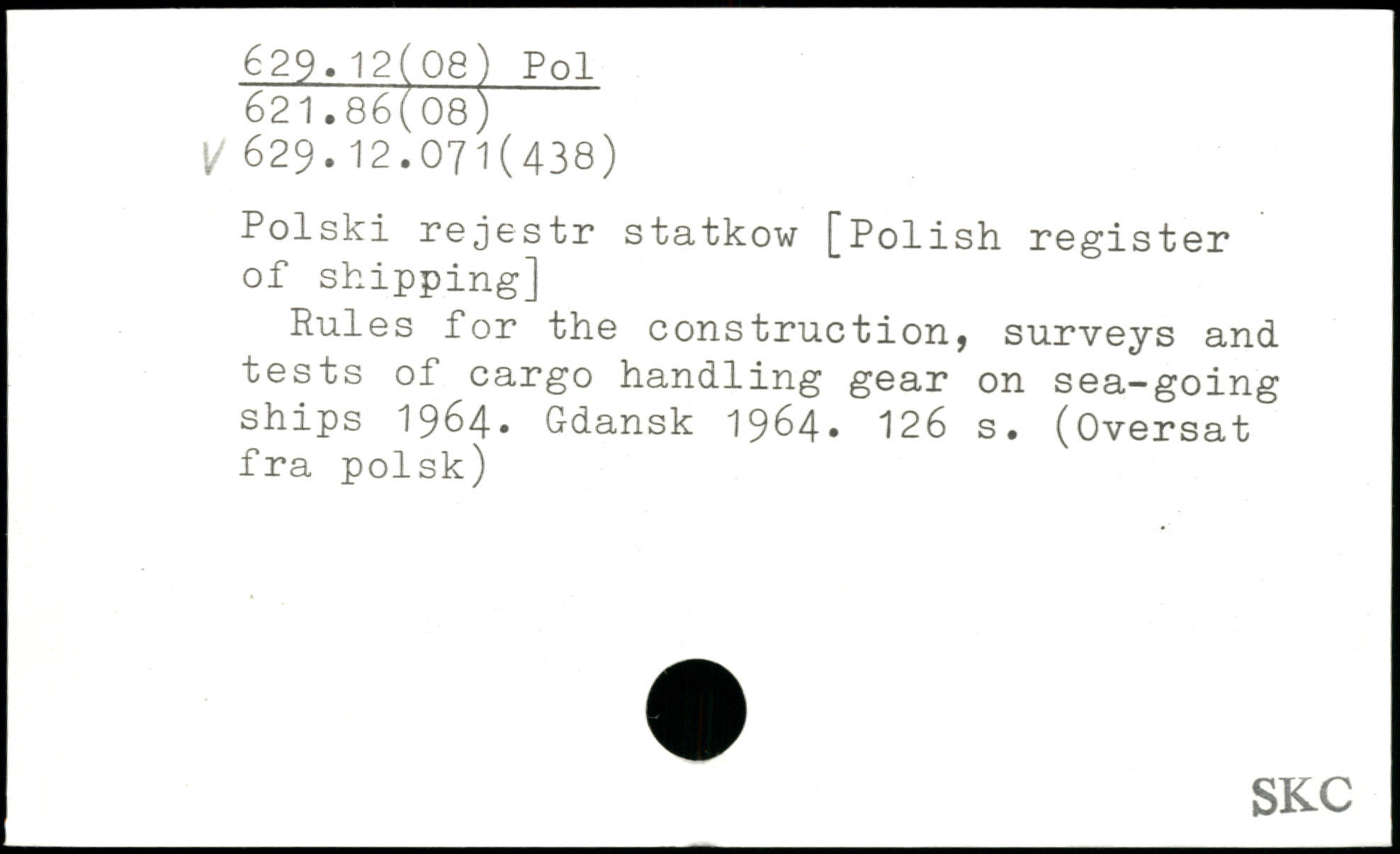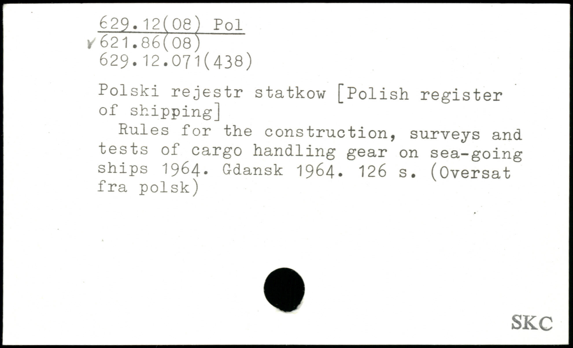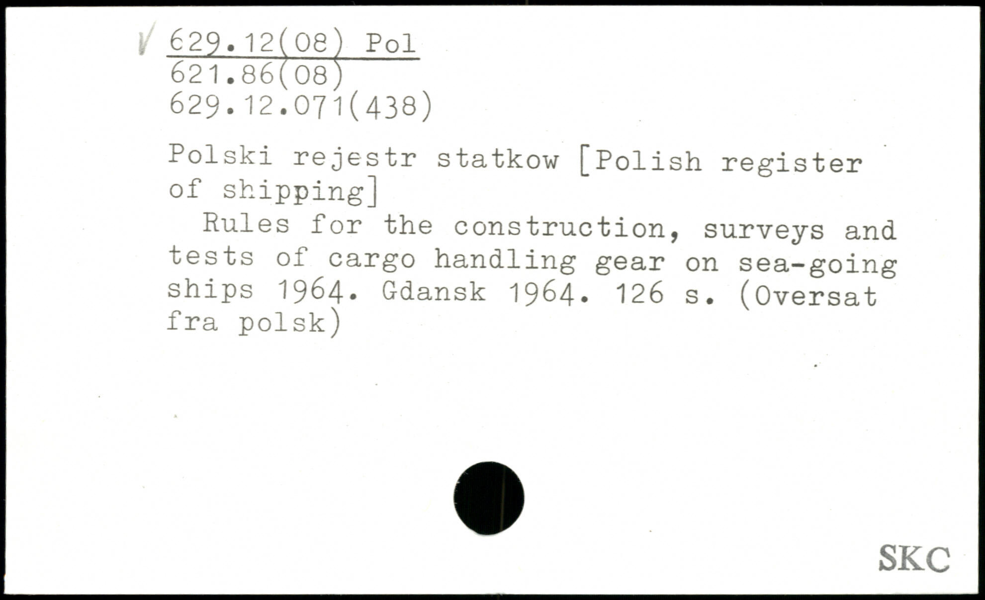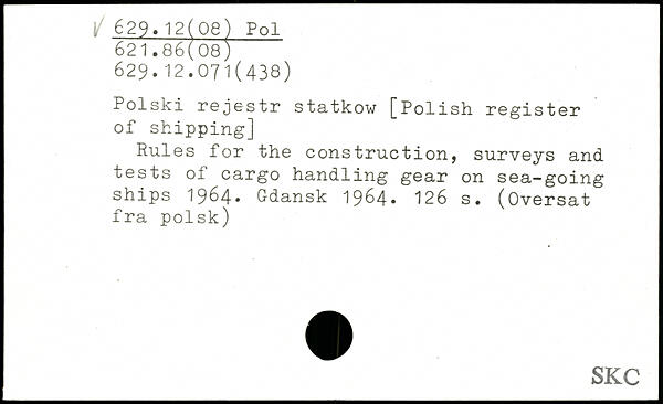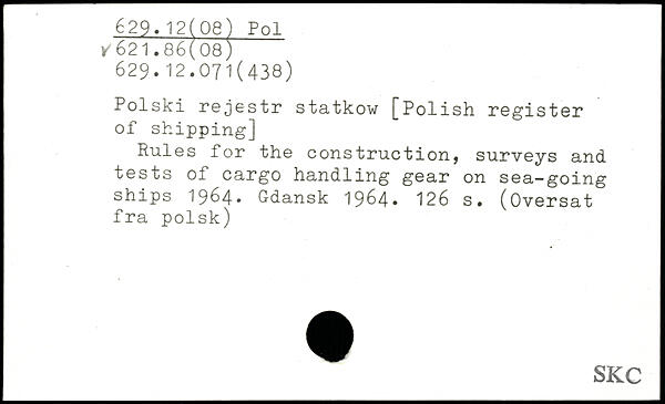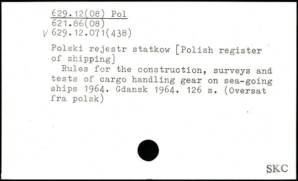 Polski rejestr statkow [Polish register of shipping] Rules for the construction, surveys and tests of cargo handling gear on sea-going ships 1964. Gdansk 1964.