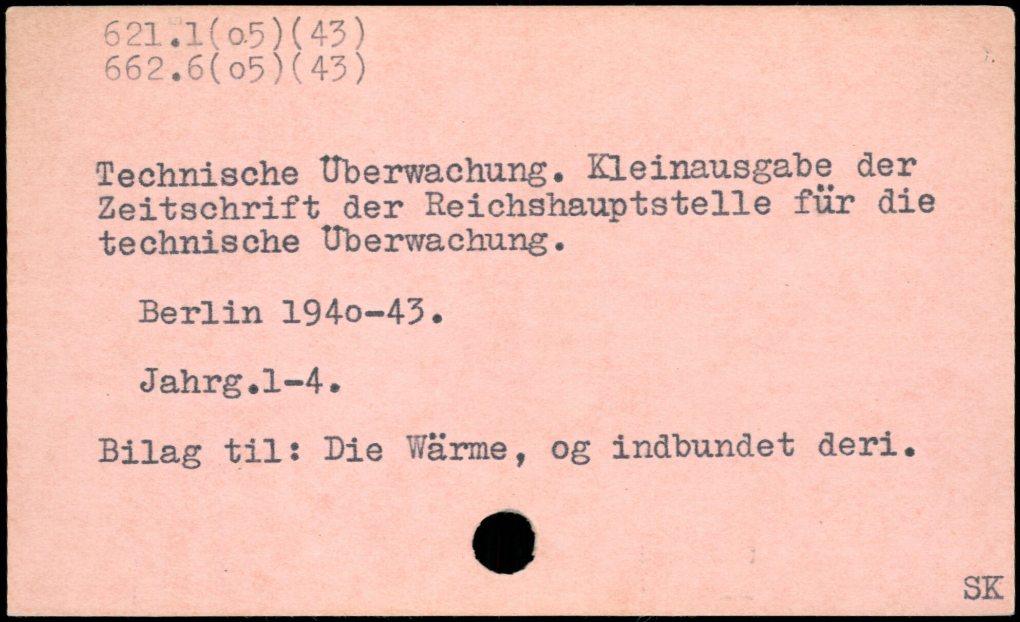 Technische Überwachung. Kleinausgabe der Zeitschrift der Reichshauptstelle für die technische Überwachung. Berlin 194o-43. Jahrg.1-4. Bilag tiis Die Wärme, og indbundet deri.