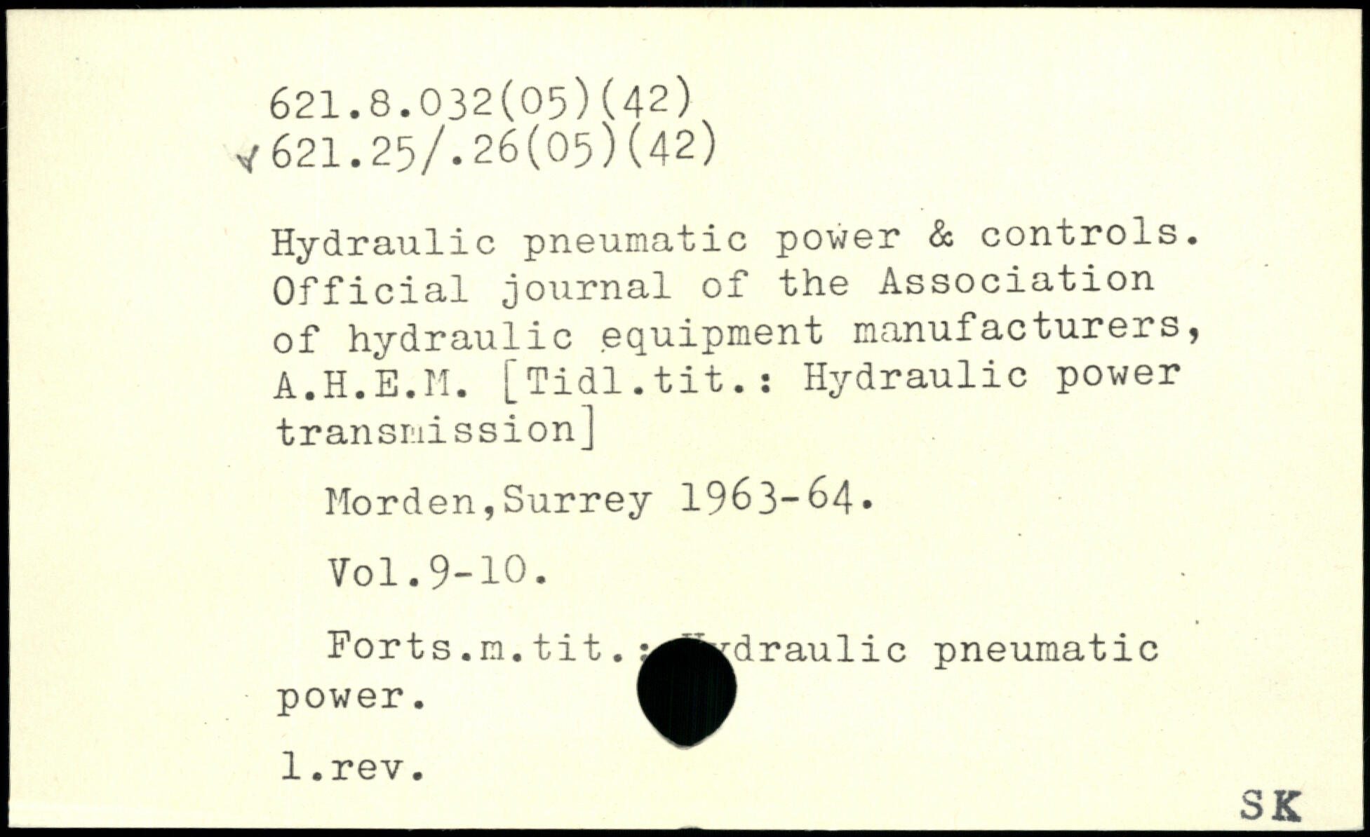 Hydraulic pneumatic power & controls. Official journal of the Association of hydraulic equipment manufacturers, A.H.E.M. [Tidl.tit.: Hydraulic power transmission] Morden,Surrey 1963-64.