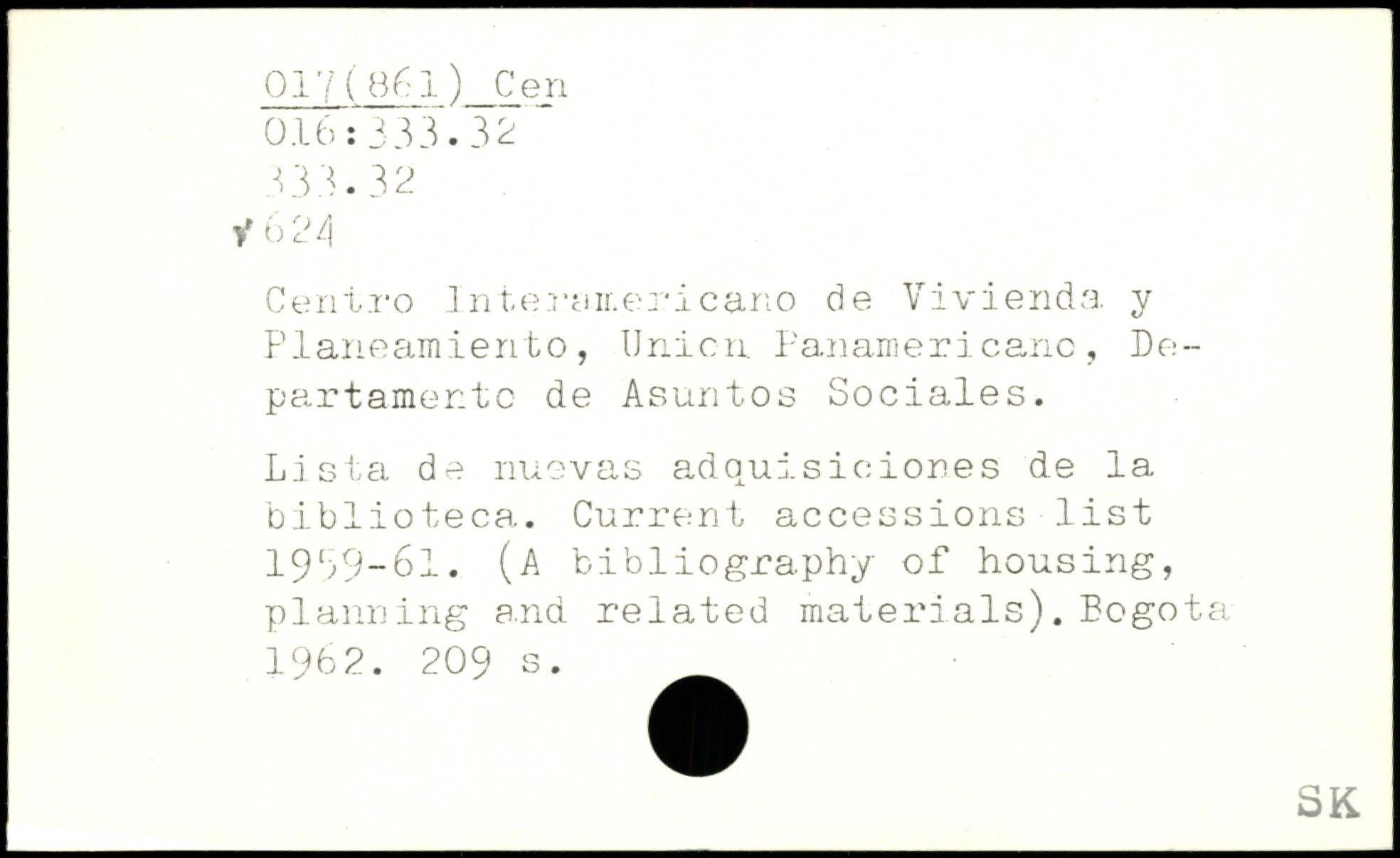 Centro 1nterair.ericano de Vivienda y Planeamiento, Union Panamericanc, De-partamentc de Asuntos Sociales. Lista de nuevas adquisioiones de la biblioteca. Current accessions list 1939-61. (A bibliography of housing, planning a.nd related materials). Bogota 196 2.