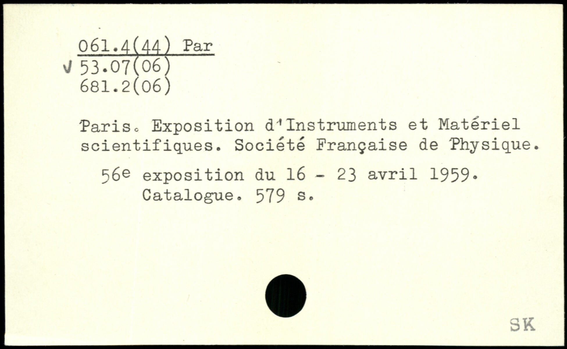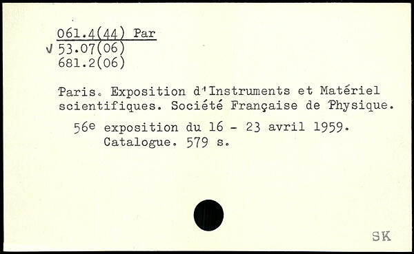 'Pariso Exposition d.Instruments et Materiel scientifiques. Société Française de Physique. 56e exposition du 16 - 23 avril 1959, Catalogue.