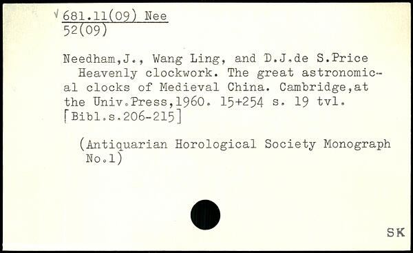 Needham,J., Wang Ling, and D.J.de S.Price Heavenly clockwork. The great astronomical clocks of Medieval China. Cambridge,at the UnivoPress,1960.
