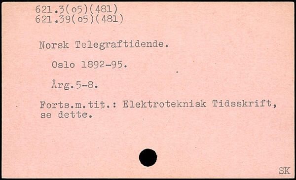 Norsk Telegraftidende. Oslo 1892-95. Arg.5-8. Forts.m.tit.: Elektroteknisk Tidsskrift, se dette.