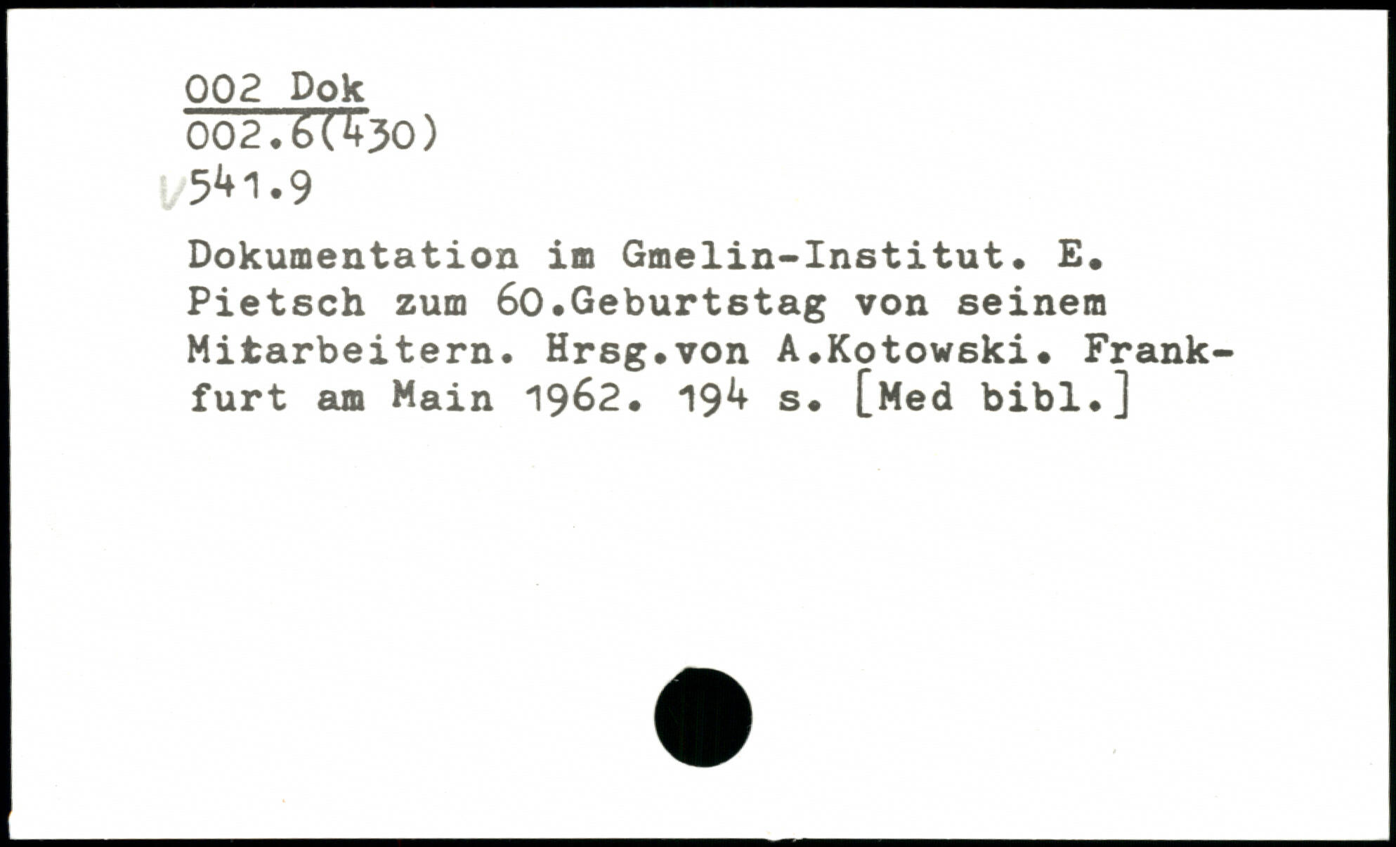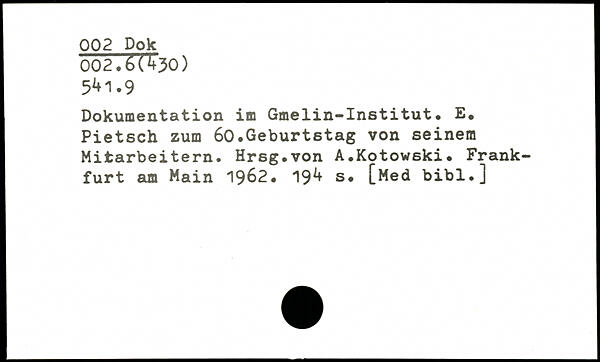 Dokumentation im Gmelin-Institut. E. Pietsch zum 60.Geburtstag von seinem Mitarbeitern. Hrsg.von A.Kotowski.