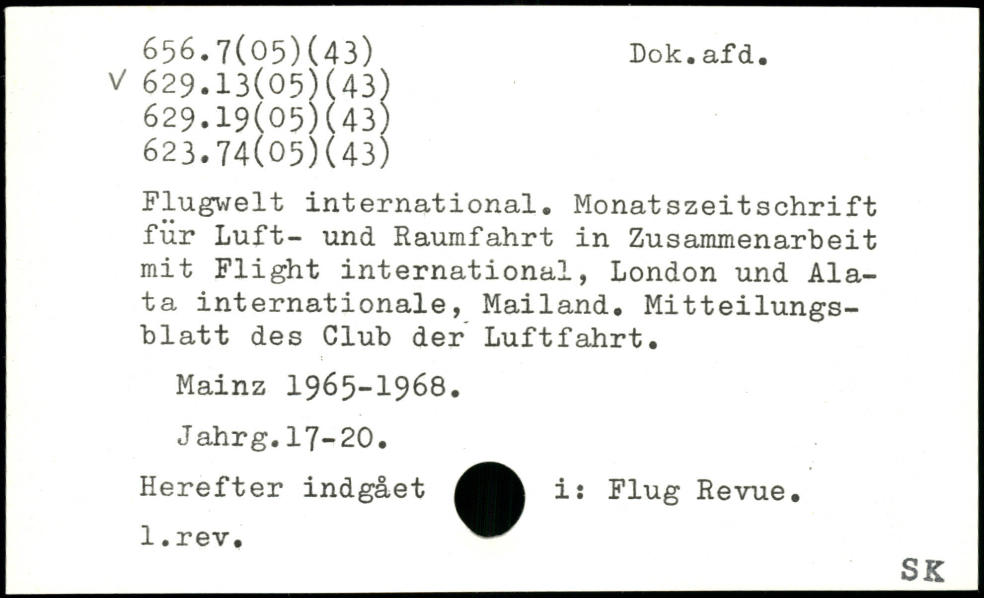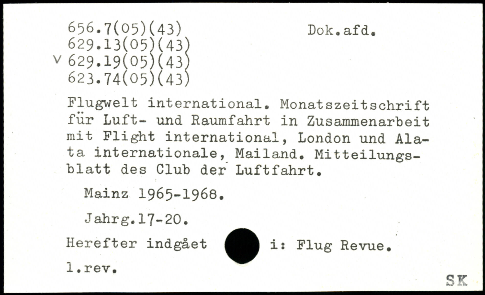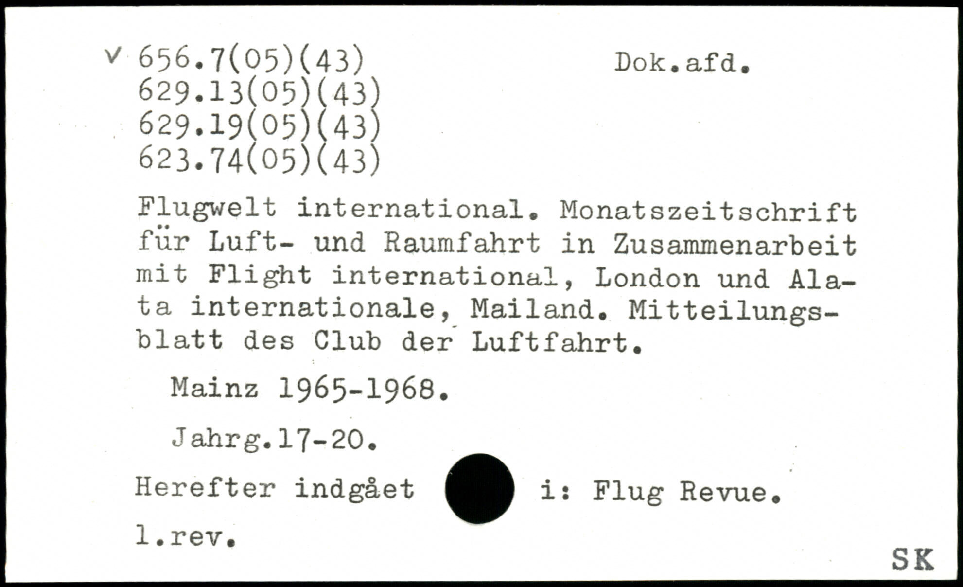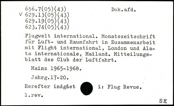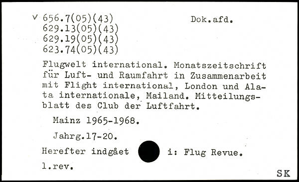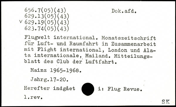 Flugwelt international. Monatszeitschrift für Luft- und Raumfahrt in Zusammenarbeit mit Flight international, London und Ala-ta internationale, Mailand. Mitteilungsblatt des Club der Luftfahrt. Mainz 1965-1968. Jahrg.17-20. Herefter indgået i: Flug Revue.