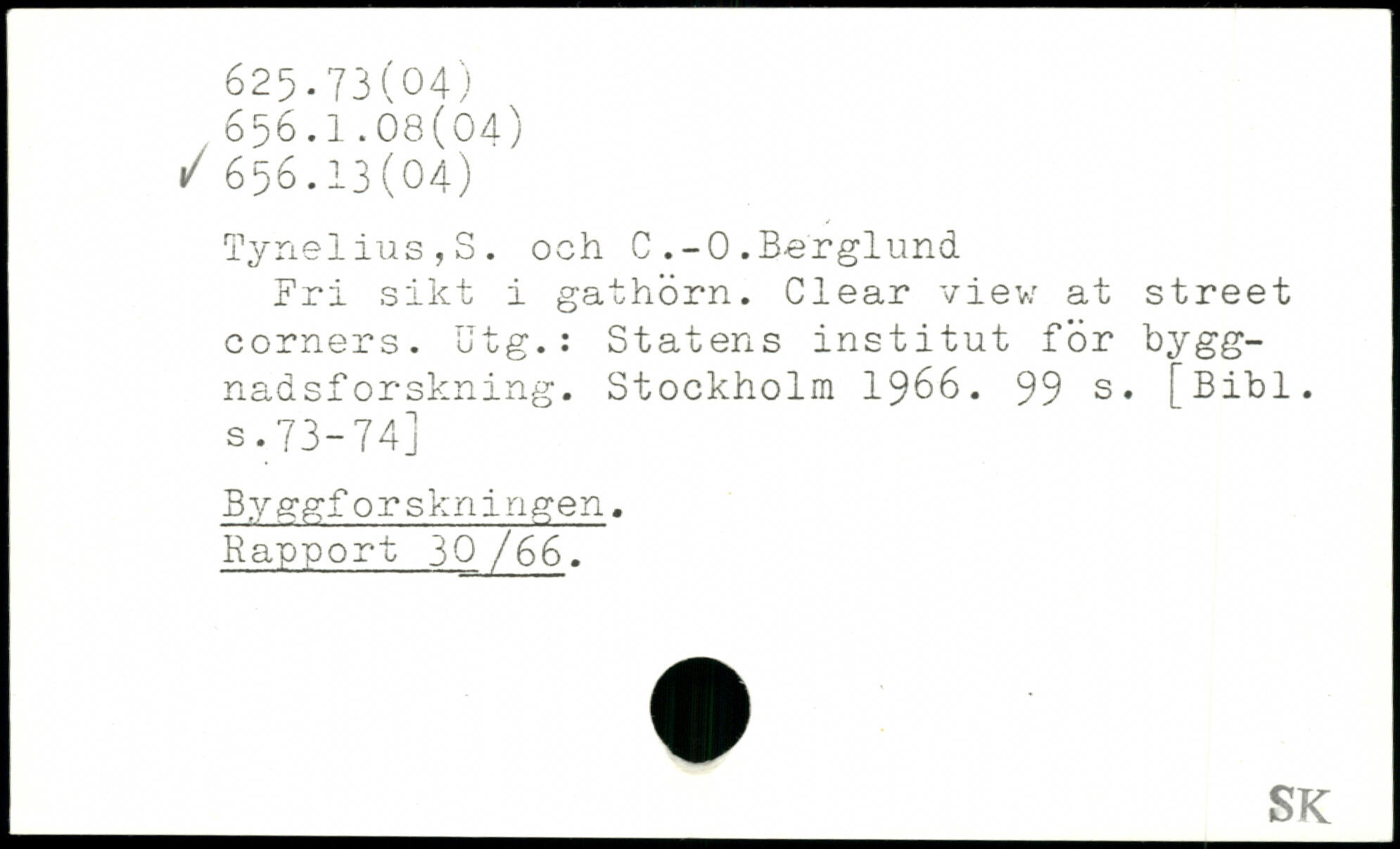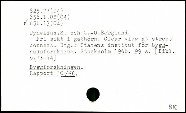 Tynelius,S. och C .-0.Berglund Fri sikt i gathörn. Clear view at Street corners. Utg.: Statens institut för bygg-nadsforskning.
