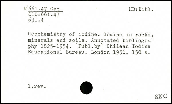 Geochemistry of iodine. Iodine in rocks, minerals and soils. Annotated bibliography 1825-1954.