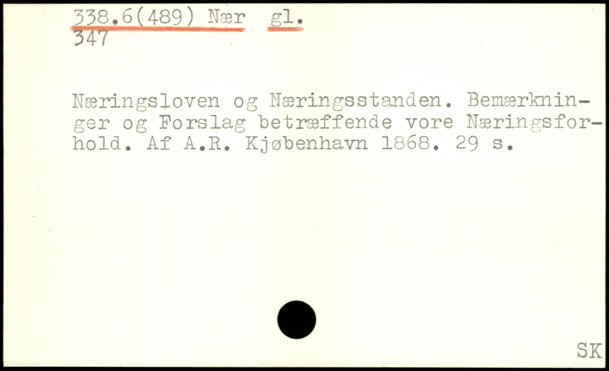 Næringsloven og Næringsstanden. Bemærkninger og Porslag betræffende vore Næringsforhold. Af A.R. Kjøbenhavn 1868.