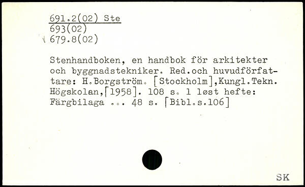 Stenhandboken, en handbok för arkitekter och byggnadstekniker, Red.och huvudförfattare: H,borgström0 [Stockholm],Kungl.Tekn. Högskolan,f1958].
