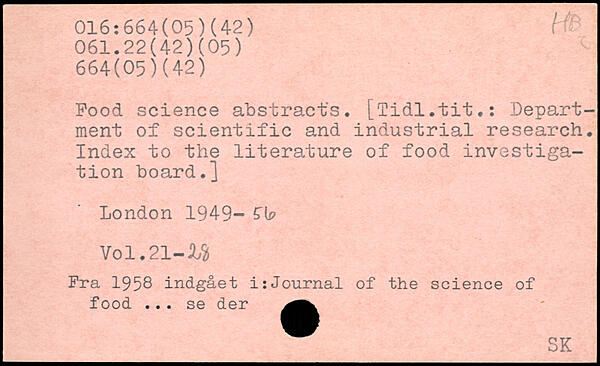 Pood science abstract's. [Tidl.tit.: Department of scientific and industrial research. Index to the literature of food investigation board.]