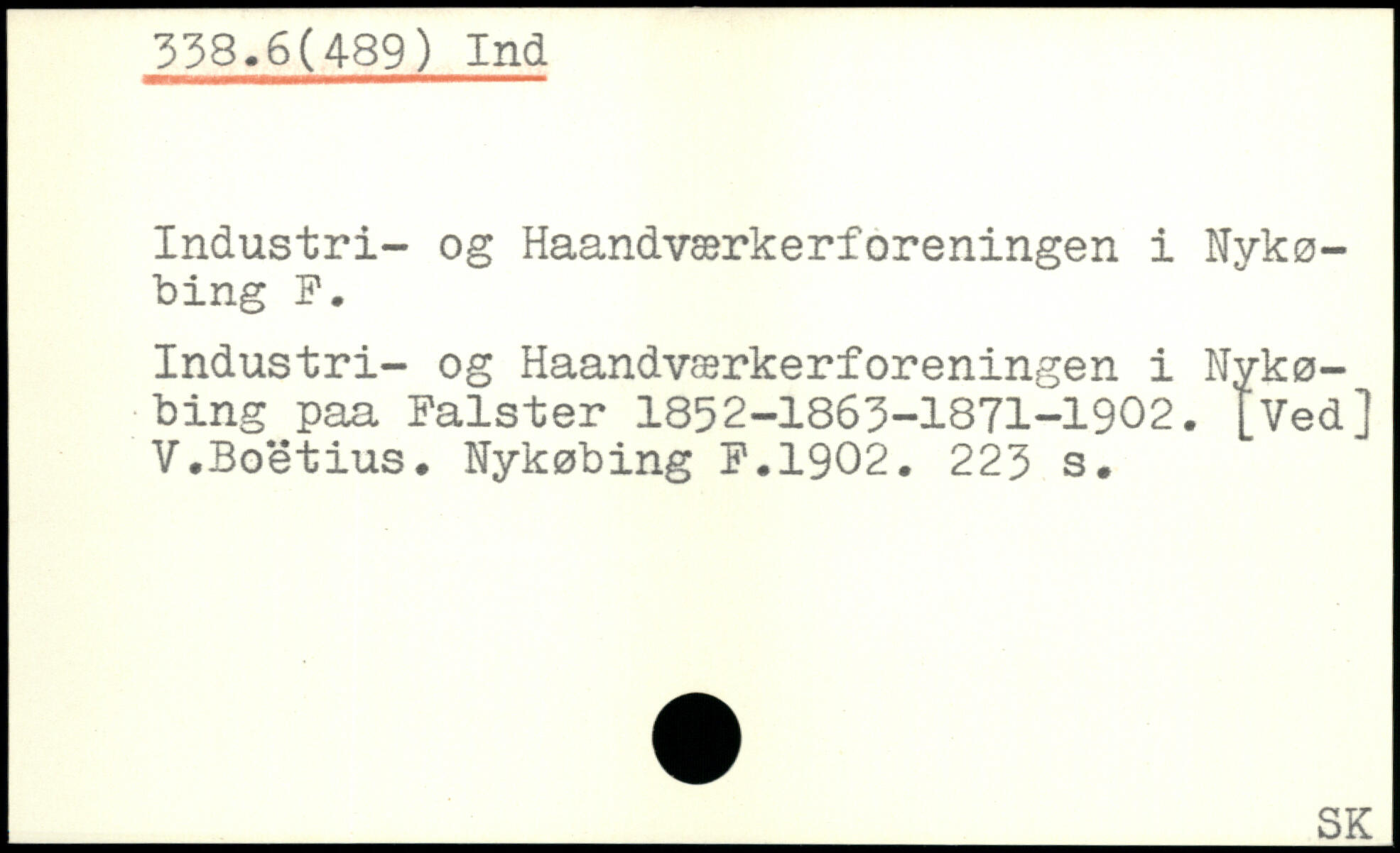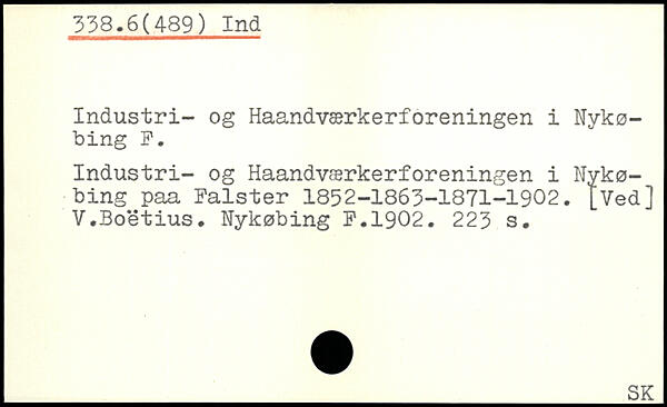 Industri- og Haandværkerforeningen i Nykøbing F. Industri- og Haandværkerforeningen i Nykøbing paa Falster 1852-1863-1871-1902. [Ved] V.So'étius. Nykøbing F.1902.
