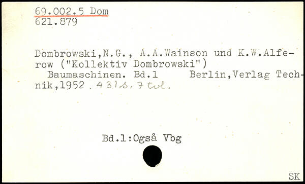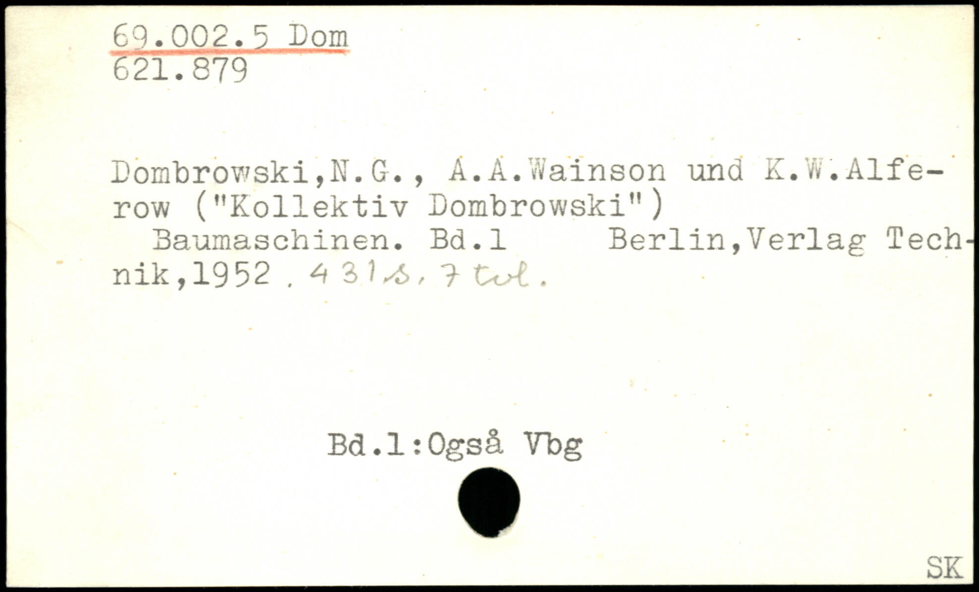 Bombrowski,N.G., A.Ä.Wainson und K.W.Alfe-row (”Kollektiv Dombrowski") Baumaschinen. Bd.l Berlin,Verlag Tech nik, 19 52. 4 %)A, 9- UA. Bd.l:Ogsä Vbg