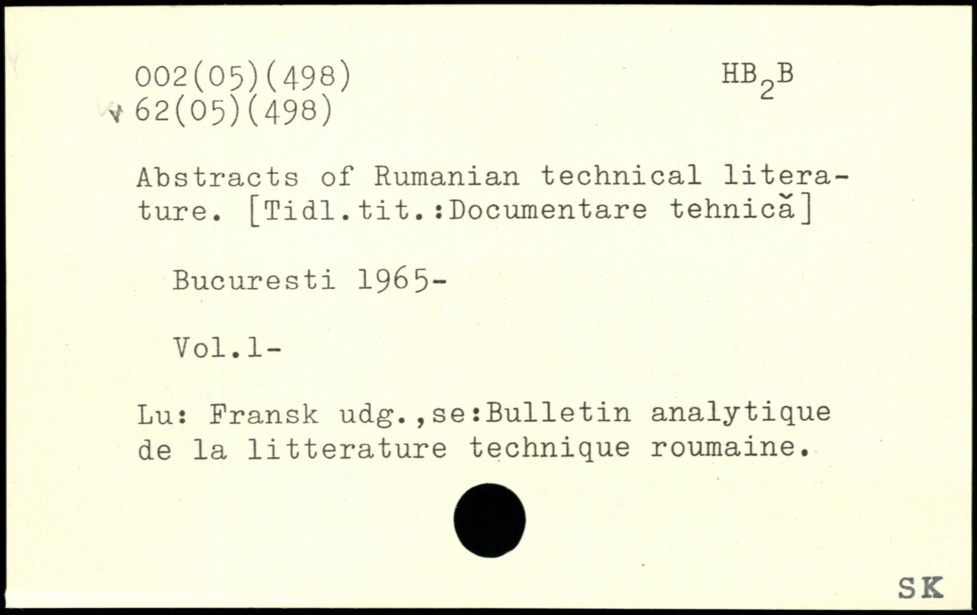 Abstracts of Rumanian technical literature. [Tidl. tit. :Documentare tehnica]