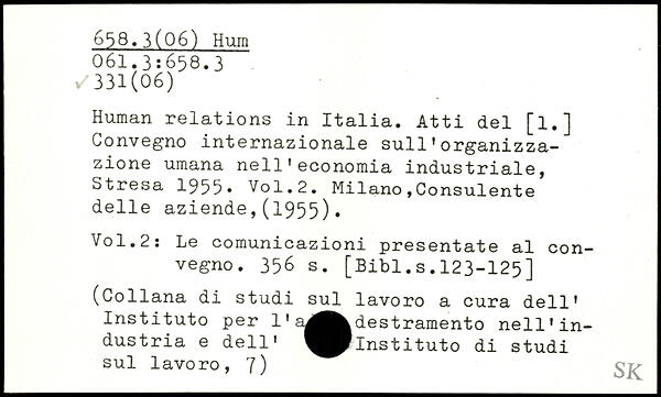Human relations in Italia. Atti del [l.] Convegno internazionale sull'organizza-zione umana nell.economia industriale, Stresa 1955