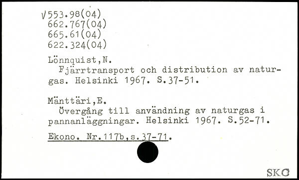 Fjärrtransport och distribution av naturgas. Helsinki 19^7. S.37-51. Mänttäri ,E. övergång till användning av naturgas i pannanläggningar. Helsinki 19^7. S.52-71. Ekono. Nr. 11 7~b , s ^71.