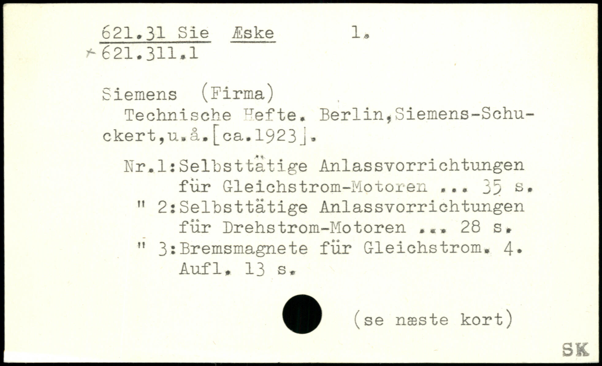 Technische ^efte. Berlin,Siemens-Schu- ckert,u.å.[ca.1923j. Fr.1:Selbsttätige Anlassvorrichtungen für Gleichstrom-Motoren ... 35 " 2:Selbsttätige Anlassvorrichtungen für Drehstrom-Motoren ...
