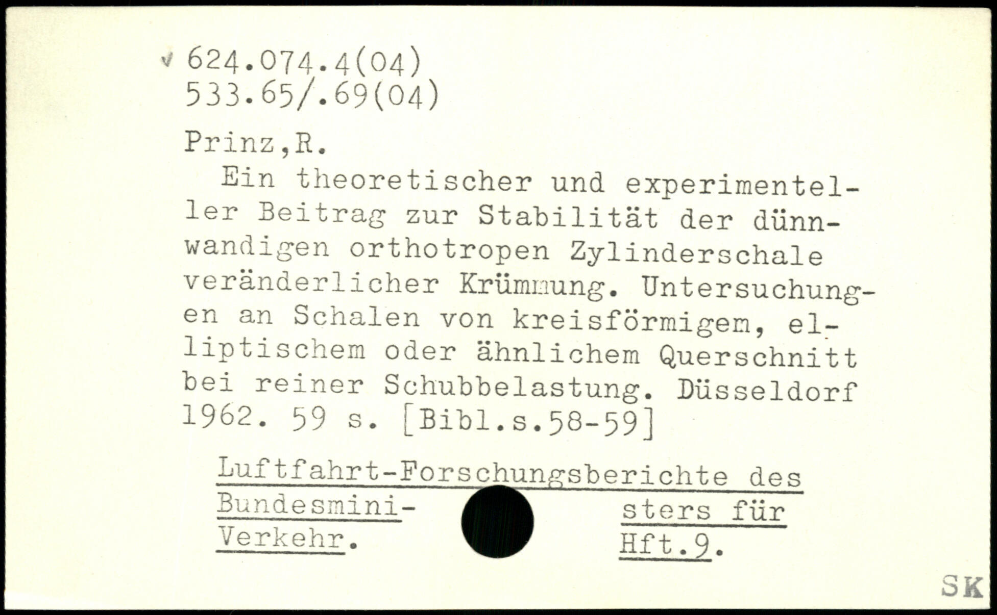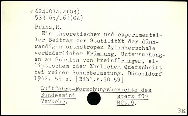 Ein theoretischer und experimentel-lei. Beitrag zur Stabilität der dünnwandigen orthotropen Zylinderschale veränderlicher Krümmung. Untersuchungen an Schalen von kreisförmigen, el-liptischem oder ähnlichem Querschnitt bei reiner Schubbelastung. Düsseldorf 1962.