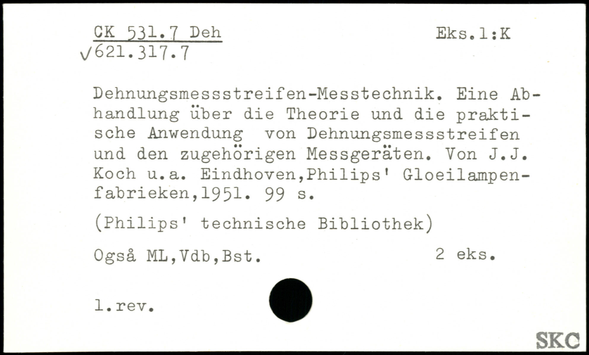 Dehnungsmessstreifen-Messtechnik. Eine Abhandlung über die Theorie und die praktische Anwendung von Dehnungsmessstreifen und den zugehörigen Messgeräten. Von J.J. Koch u.a. Eindhoven,Philips' Gloeilampen- fabrieken,1951