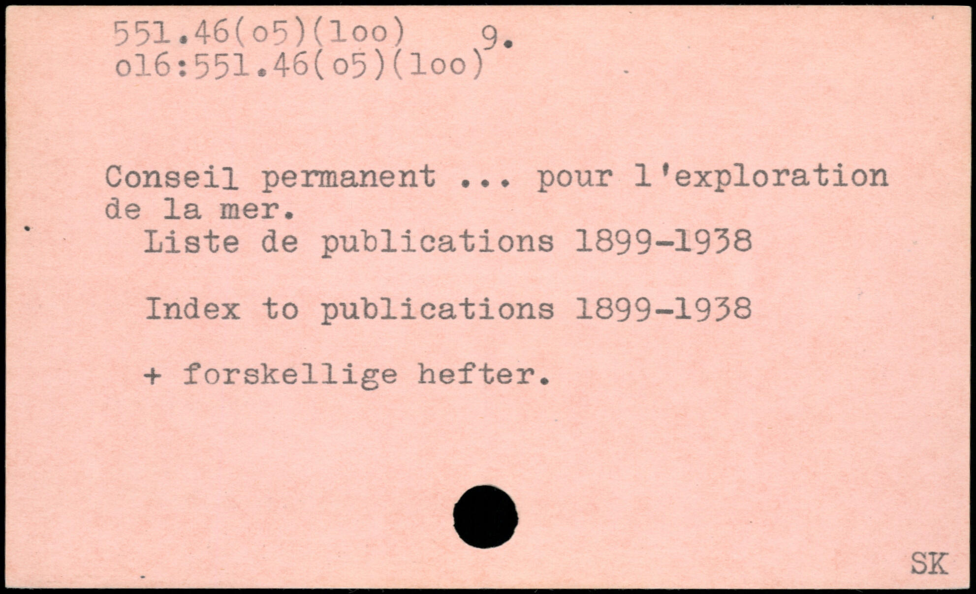 Conseil permanent ... pour l'exploration de la mer. Liste de publications 1899-1938 Index to publications 1899-1938 + forskellige hefter.