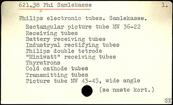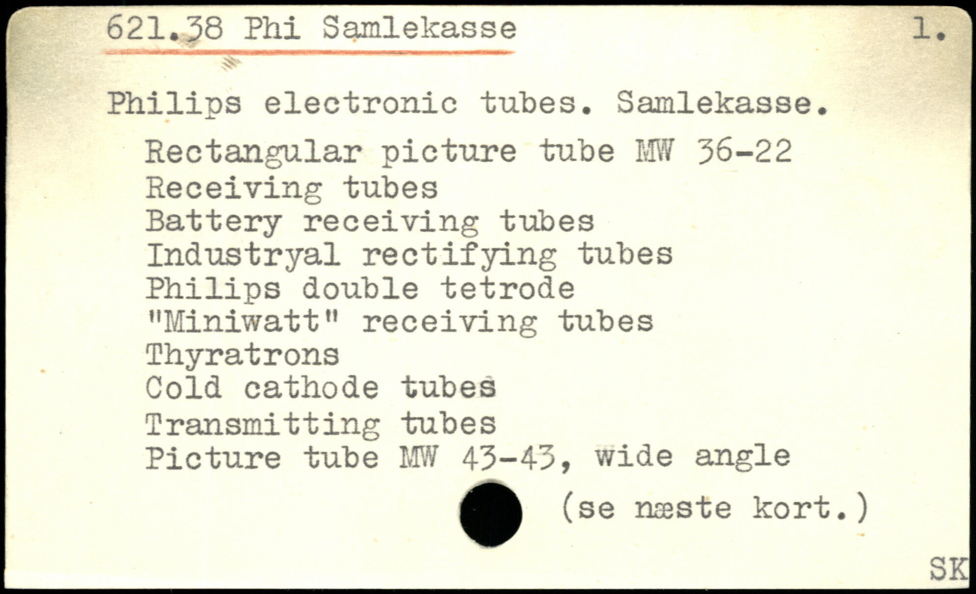 Philips electronic tubes. Samlekasse. Rectangular picture tube MW 36-22 Receiving tubes Battery receiving tubes Industryal rectifying tubes Philips double tetrode "Miniwatt" receiving tubes Thyratrons Cold cathode tubes Transmitting tubes Picture tube MW 43-43, wide angle