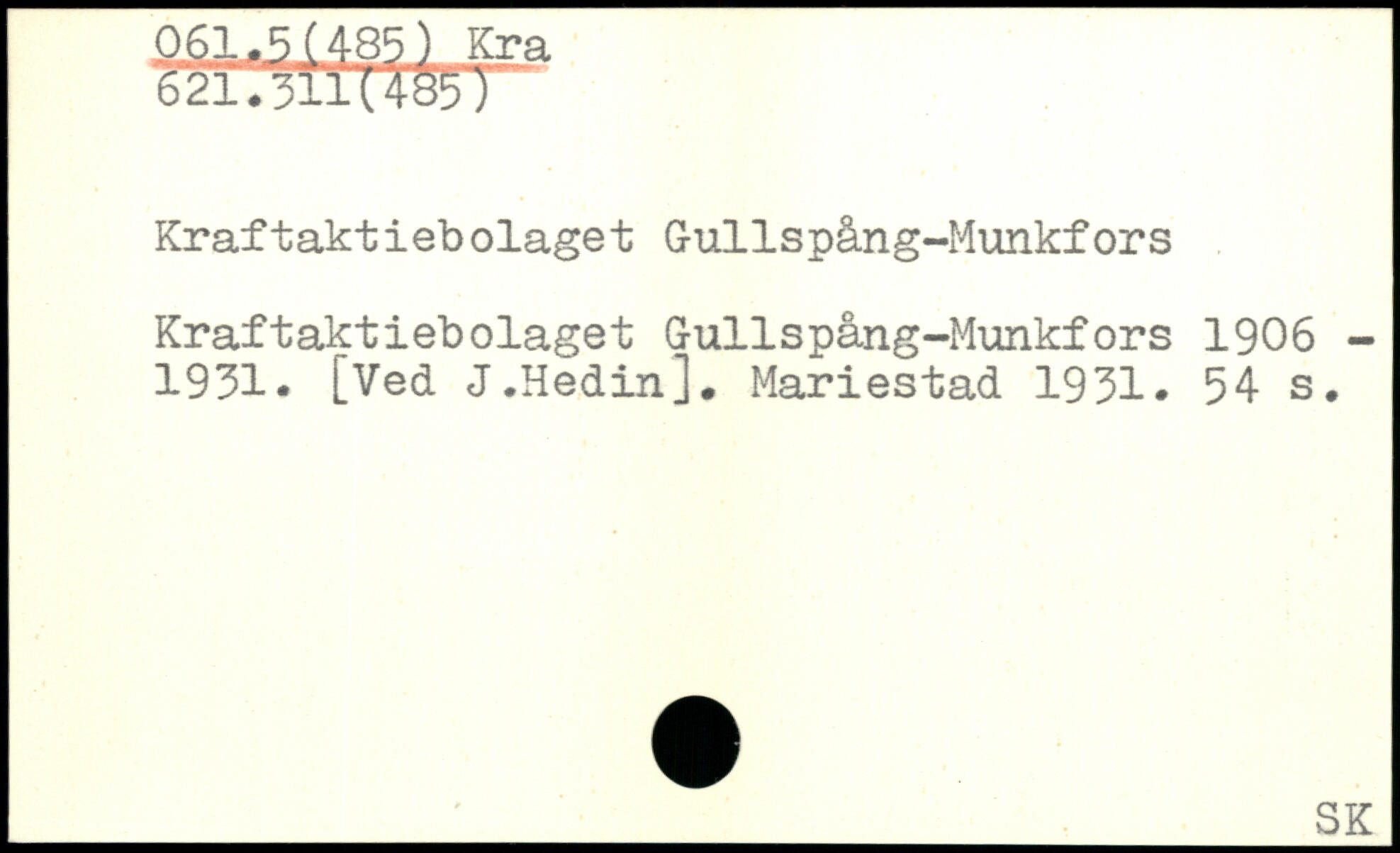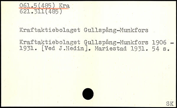 Kraftaktiebolaget Gullspång-Munkfors Kraftaktiebolaget G-ullspång-Munkfors 1906 -1931- [Ved J.Hedin]. Mariestad 1931-