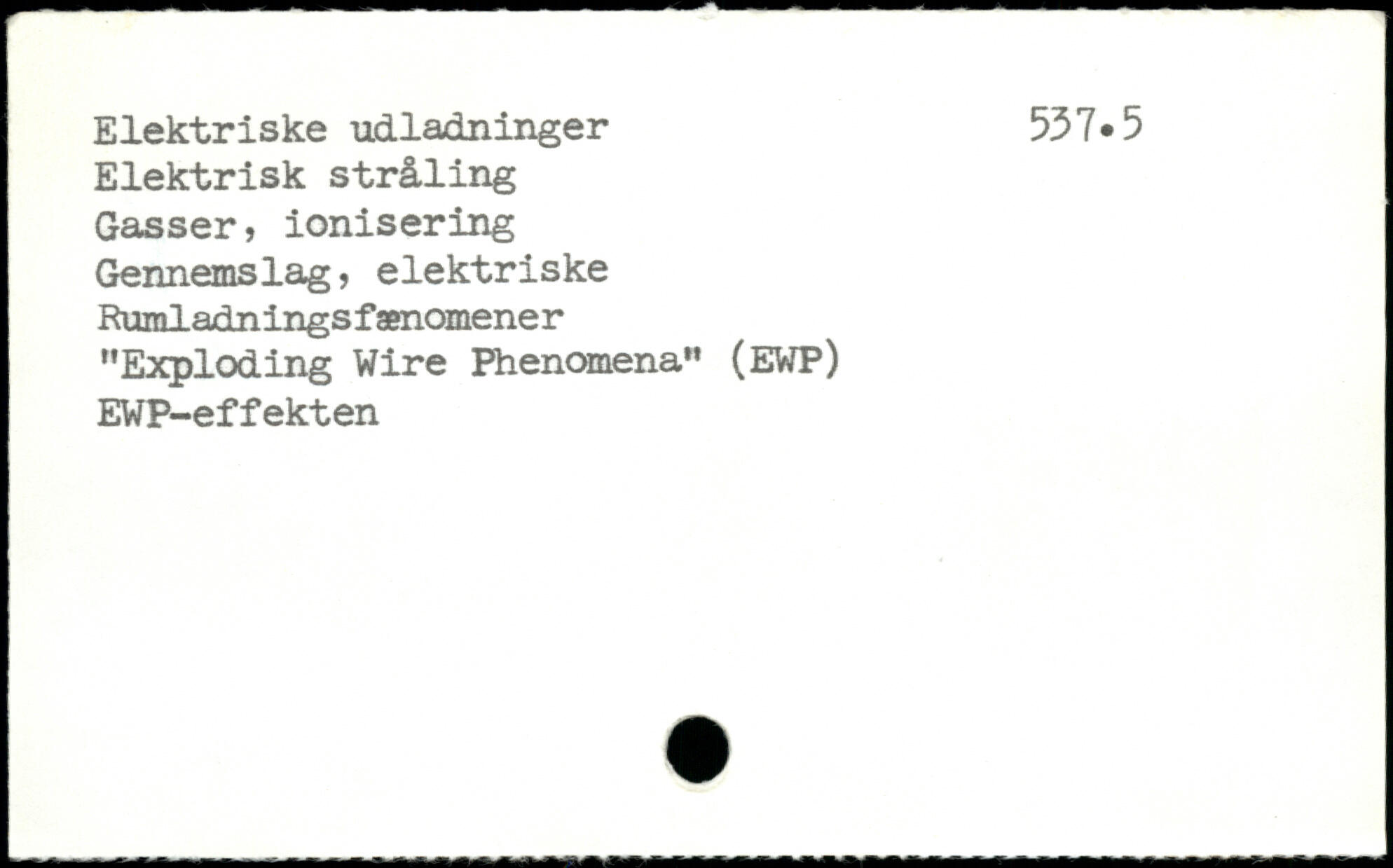 Elektriske udladninger 537.5 Elektrisk stråling Gasser, ionisering Gennemslag, elektriske Rumladnings fænomener "Exploding Wire Phenomena.’ (EWP) EWP-effekten