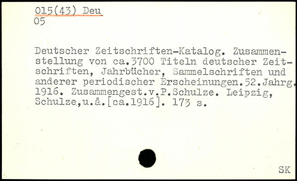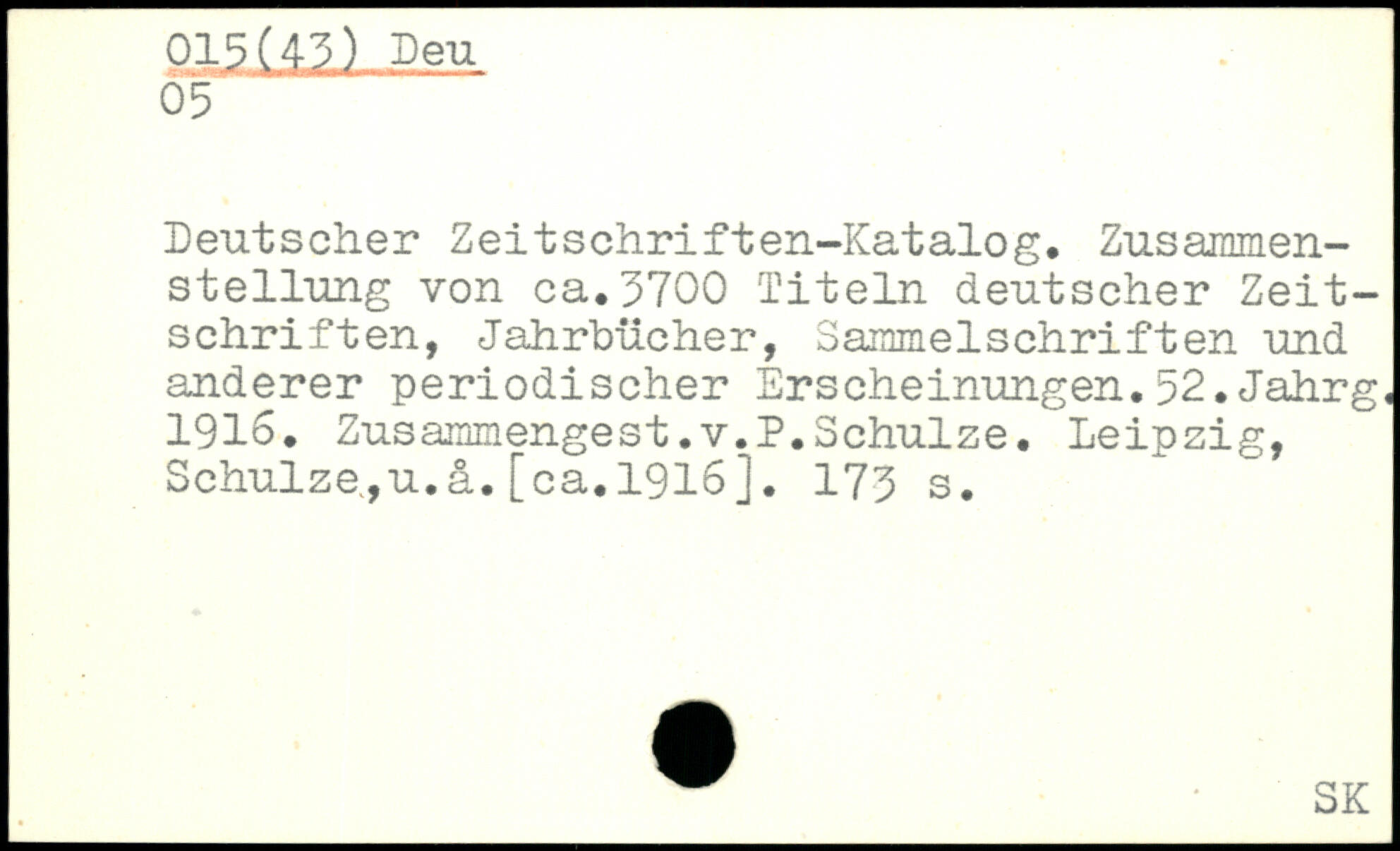 Deutscher Zeitschriften-Katalog. Zusammenstellung von ca.3700 Titeln deutscher Zeitschriften, Jahrbücher, SarnmelSchriften und anderer periodischer Erscheinungen.52.Jahrg, 1916. Zusammengest.v.P.Schulze. Leipzig, Schulze,u.ä.[ca.1916j.