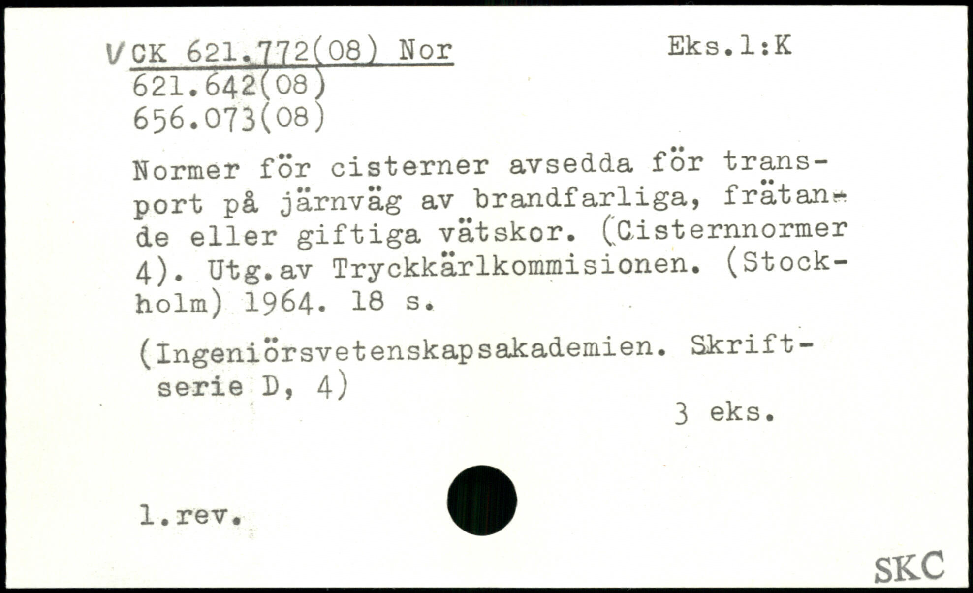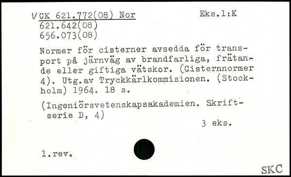 Normer för cisterner avsedda för transport på järnväg av brandfarliga, frätande eller giftiga vätskor. ('Gisternnormer 4). Utg.av Tryckkärlkommisionen. (Stockholm) 1964