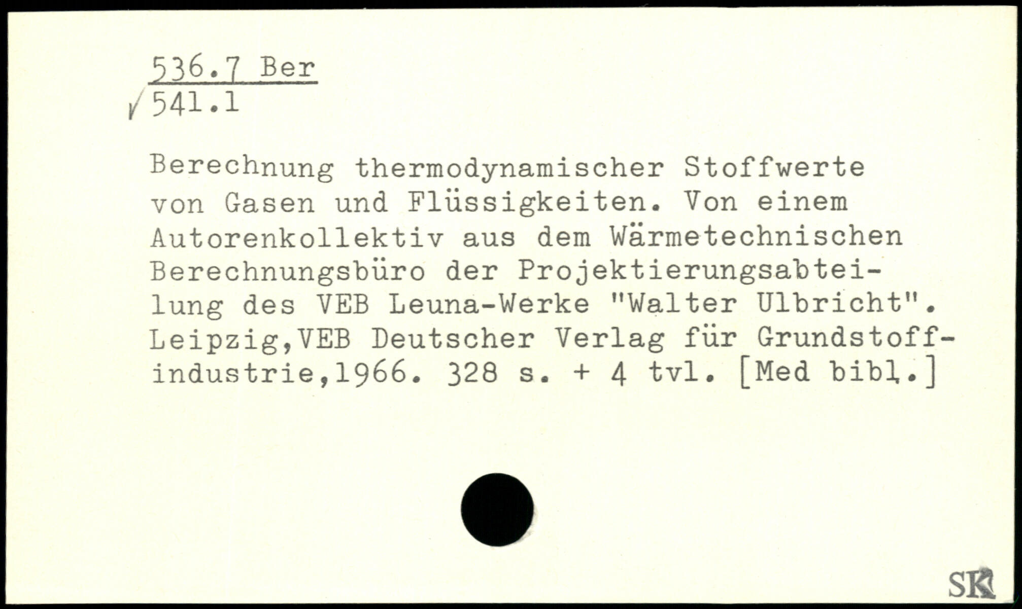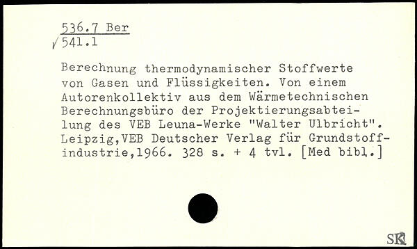 Berechnung thermodynamischer Stoffwerte von Gasen und Flüssigkeiten. Von einem Autorenkollektiv aus dem Wärmetechnischen Berechnungsbüro der Projektierungsabteilung des VEB Leuna-Werke "Walter Ulbricht". Leipzig,VEB Deutscher Verlag für Grundstoffindus trie,1966.