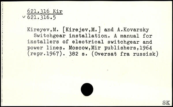 Kireyev,M. [Kirejev,M.] and A.Kovarsky Switchgear installation. A manual for installers of electrical switchgear and power lines.