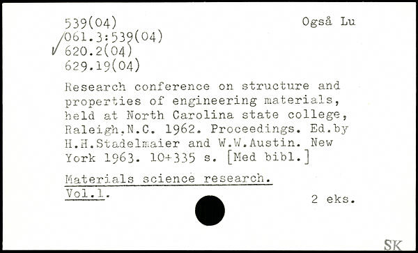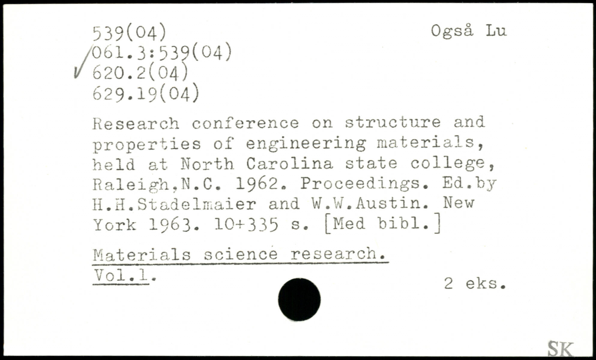 Research conference on structure and properties of engineering materials, held at North Carolina state college, Raleigh,N.C. 1962. Proceedings. Ed.by H.H,Stadelmaier and W.V.Austin.