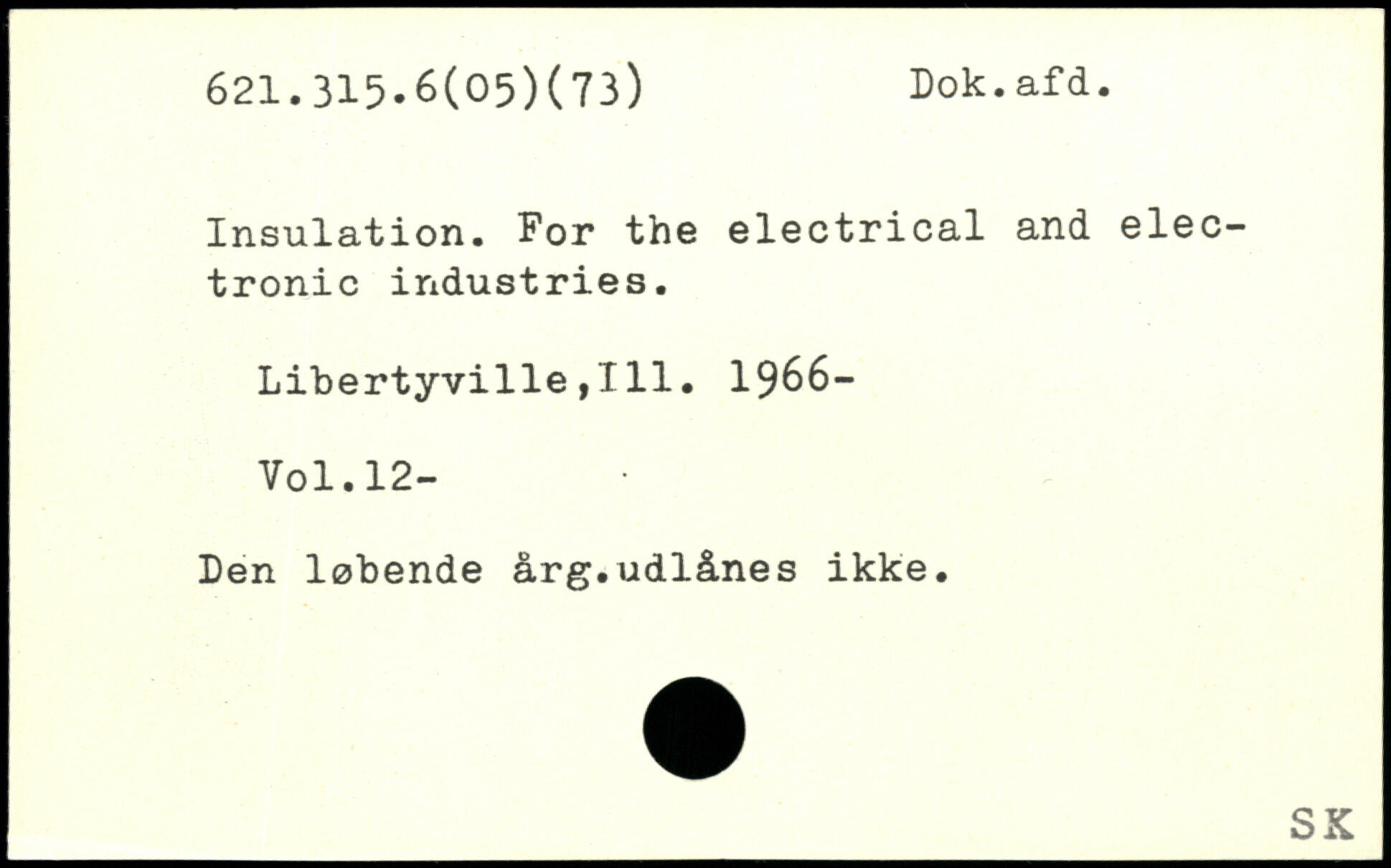 Insulation. For the electrical and electronic industries. Libertyville,111. 1966- Yol.12- Den løbende årg.udlånes ikke. SX